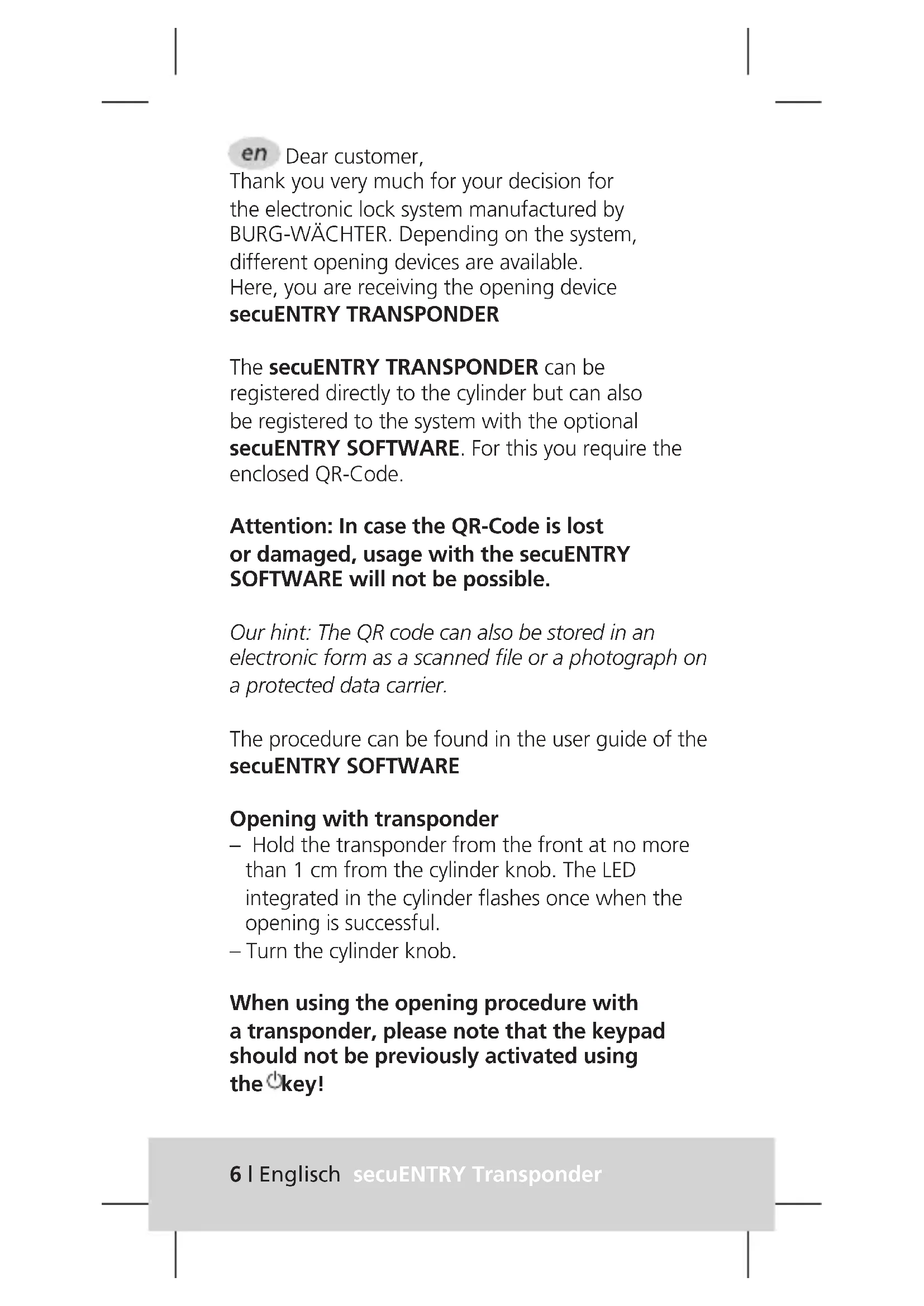Thank you very much for your decision for the electronic lock system manufactured by BURG-WACHTER. Depending on the system, different opening devices are available. Here, you are receiving the opening device secuENTRY TRANSPONDER