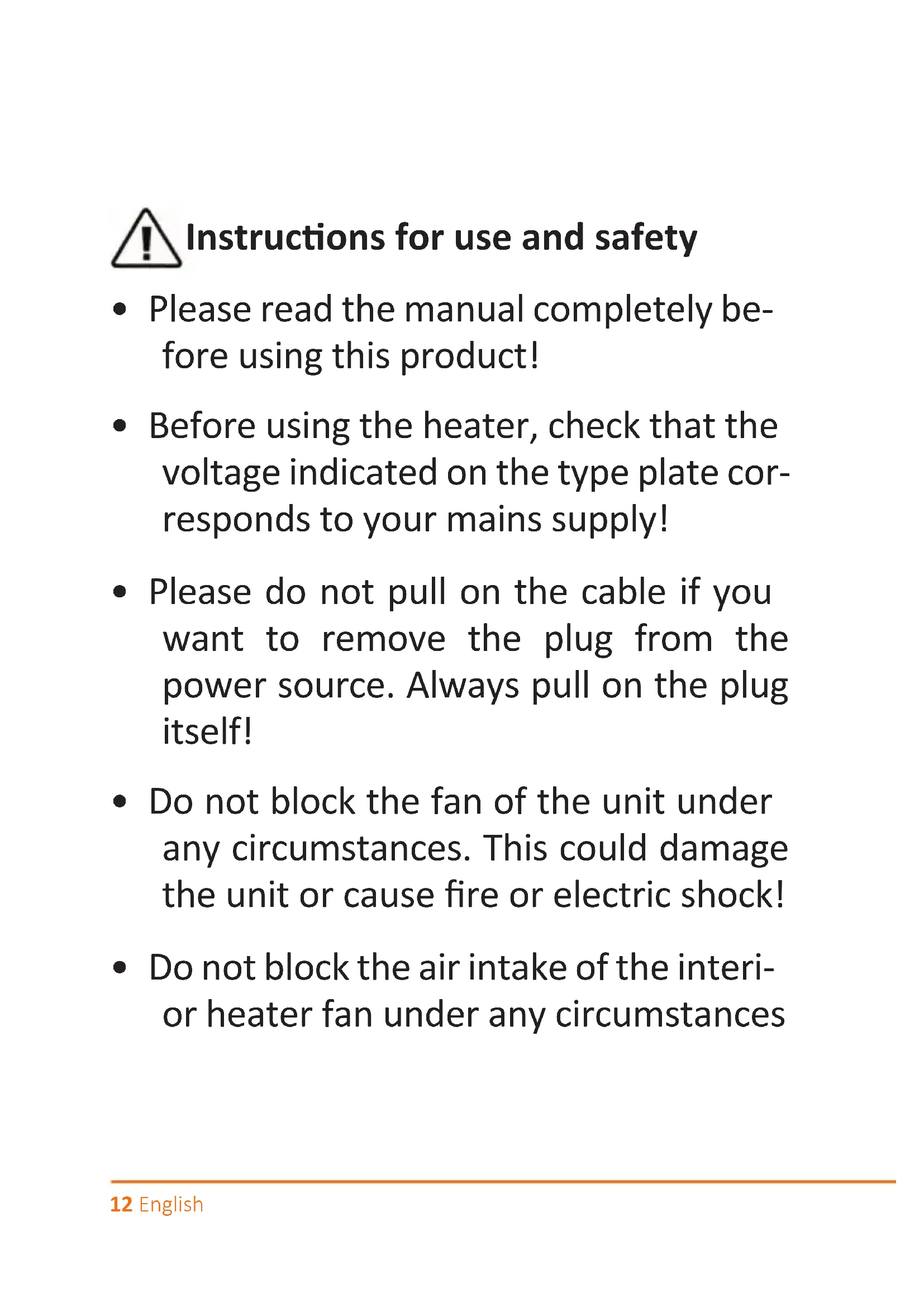 - Before using the heater, check that the voltage indicated on the type plate corresponds to your mains supply!