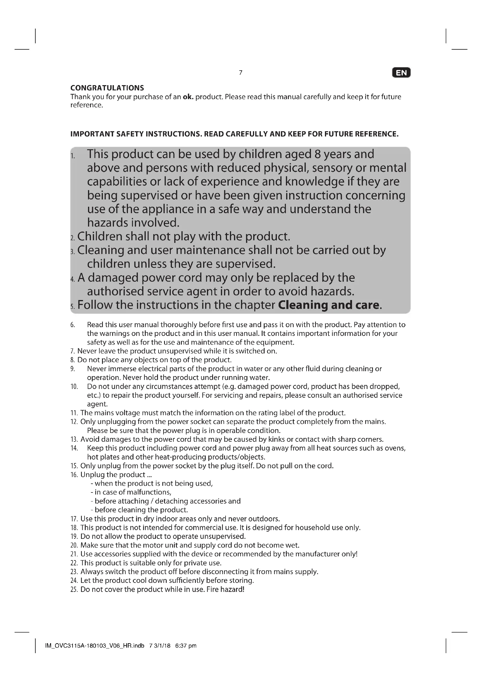 Download the instructions for your Vacuum Cleaner in PDF format for free! Find your manual OVC 3115 A - OK and take your electronic device back in hand. On this page are published all the documents necessary for the use of your device. OVC 3115 A by OK.
