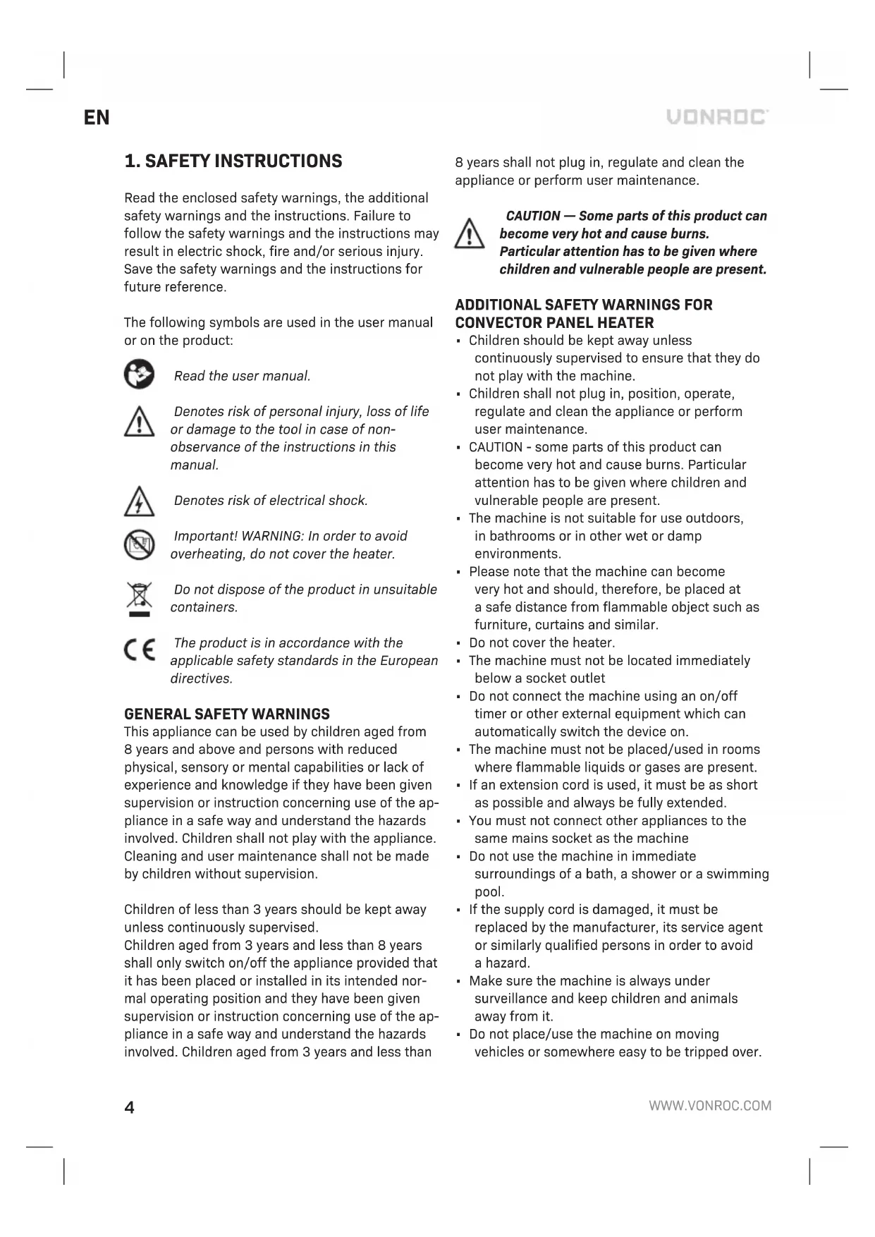 Read the enclosed safety warnings, the additional safety warnings and the instructions. Failure to follow the safety warnings and the instructions may result in electric shock, fire and/or serious injury. Save the safety warnings and the instructions for future reference. The following symbols are used in the user manual or on the product: Read the user manual. Denotes risk of personal injury, loss of life or damage to the tool in case of non- observance of the instructions in this manual. Denotes risk of electrical shock. Important! WARNING: In order to avoid overheating, do not cover the heater. Do not dispose of the product in unsuitable containers. The product is in accordance with the applicable safety standards in the European directives.
