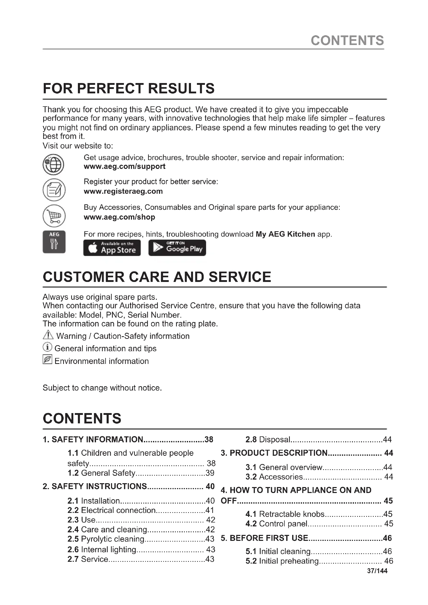 Always use original spare parts. When contacting our Authorised Service Centre, ensure that you have the following data available: Model, PNC, Serial Number. The information can be found on the rating plate. Warning / Caution-Safety information General information and tips Environmental information Subject to change without notice. CONTENTS