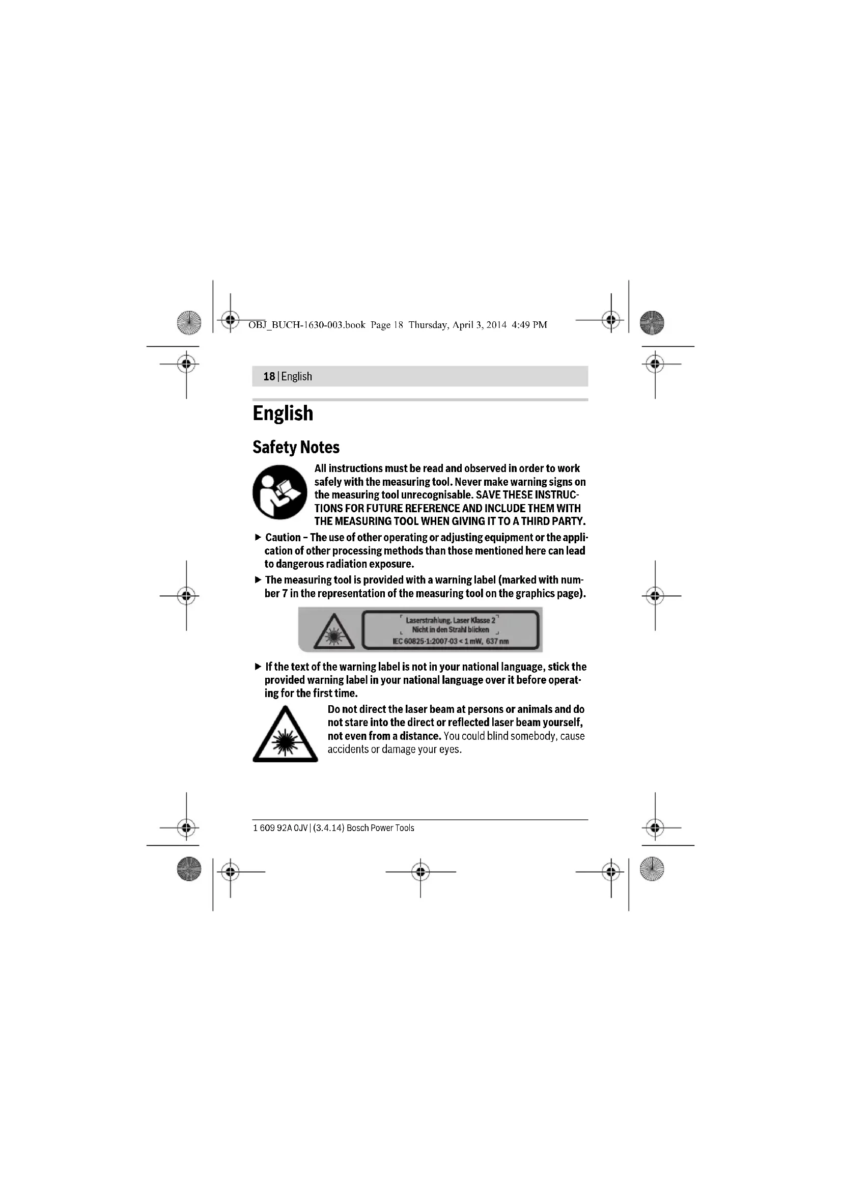 - The accessories illustrated or described are not included as standard delivery. OBJ_BUCH-1630-003.book Page 20 Thursday, April 3, 2014 4:49 PMEnglish | 21 Bosch Power Tools 1 609 92A 0JV | (3.4.14) Technical Data Cross-line Laser Quigo Article number 3 603 F63 200 Working range, min.