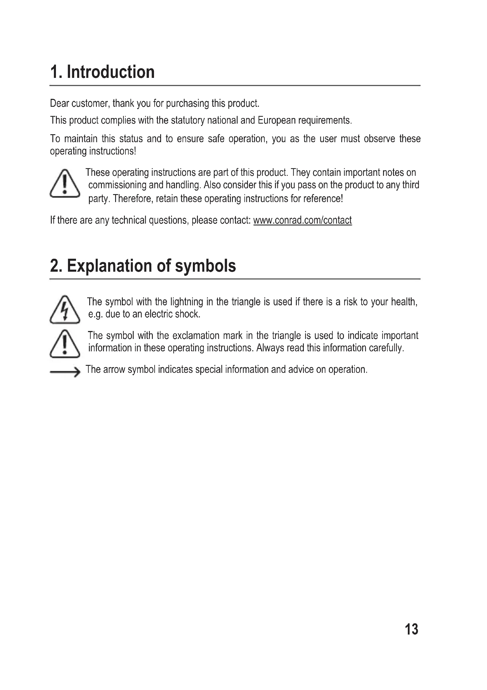 Dear customer, thank you for purchasing this product. This product complies with the statutory national and European requirements. To maintain this status and to ensure safe operation, you as the user must observe these operating instructions! These operating instructions are part of this product. They contain important notes on commissioning and handling. Also consider this if you pass on the product to any third party. Therefore, retain these operating instructions for reference! If there are any technical questions, please contact: www.conrad.com/contact