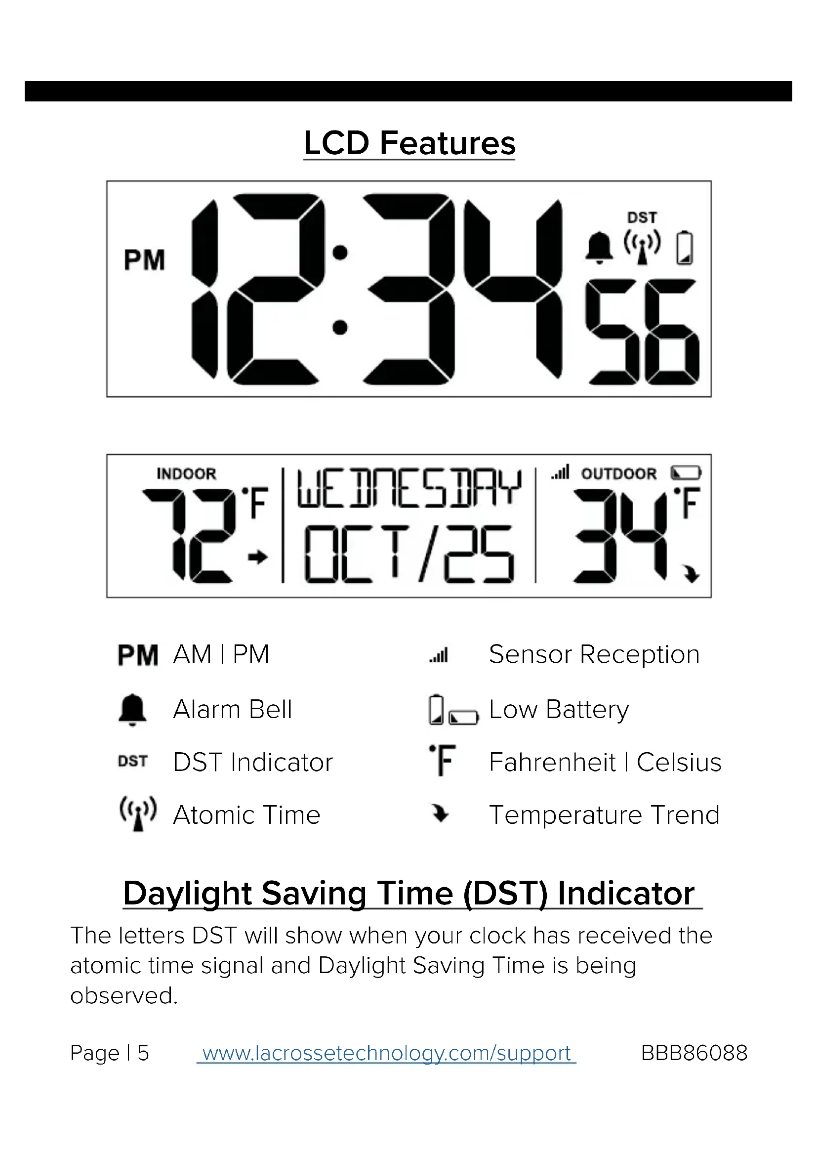 Fahrenheit | Celsius Press and release the °F/°C button to select Fahrenheit or Celsius temperature display. Fahrenheit Celsius AMLCD Features AM | PM Alarm Bell DST Indicator Atomic Time Sensor Reception Low Battery Fahrenheit | Celsius Temperature Trend Daylight Saving Time (DST) Indicator The letters DST will show when your clock has received the atomic time signal and Daylight Saving Time is being observed. Page | 5 www.lacrossetechnology.com/support BBB86088Atomic Time -WWVB Signal