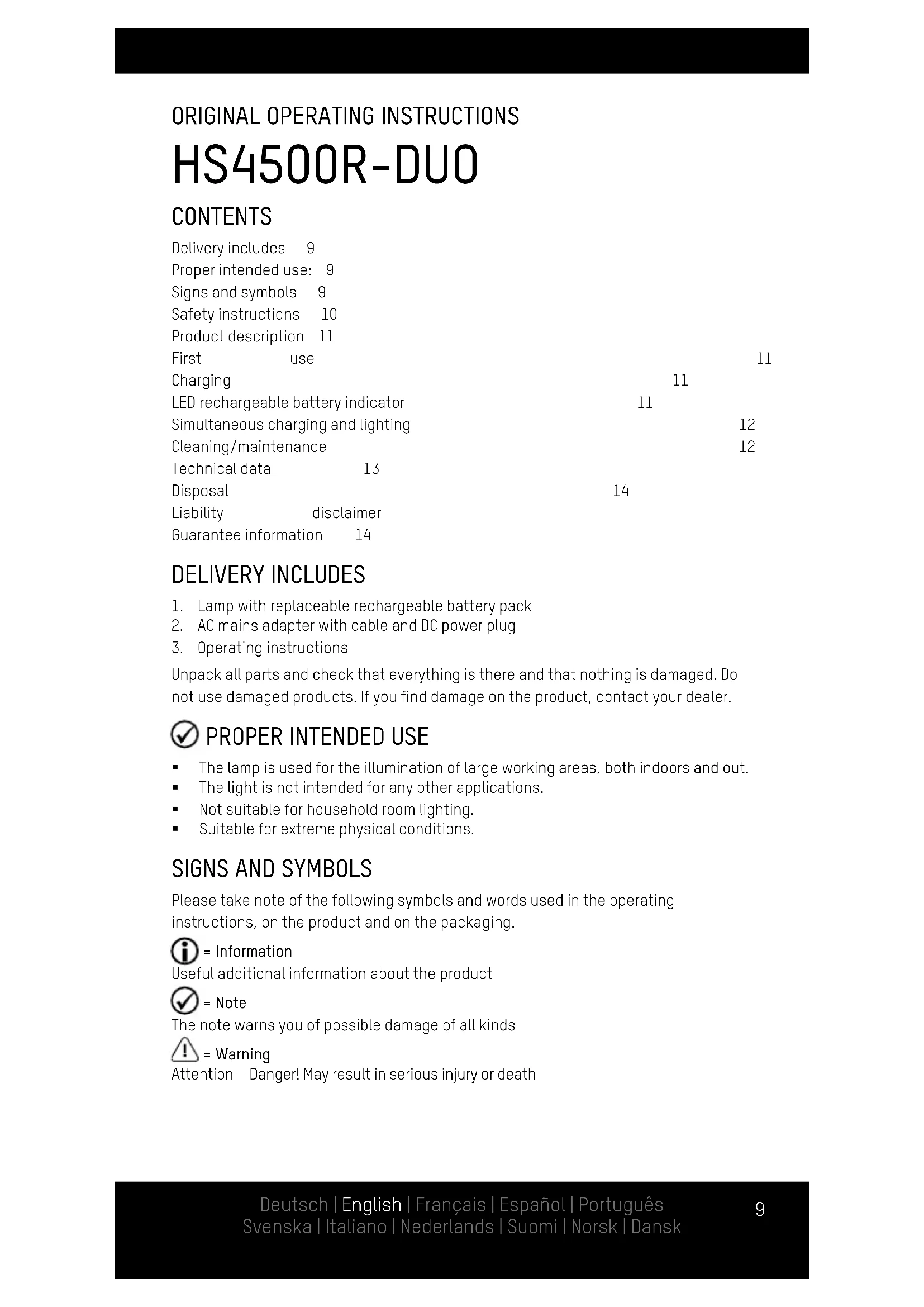 These operating instructions contain important information for the first use and normal operation of the following product: The following text refers to the hand lamp simply as the lamp or the product.