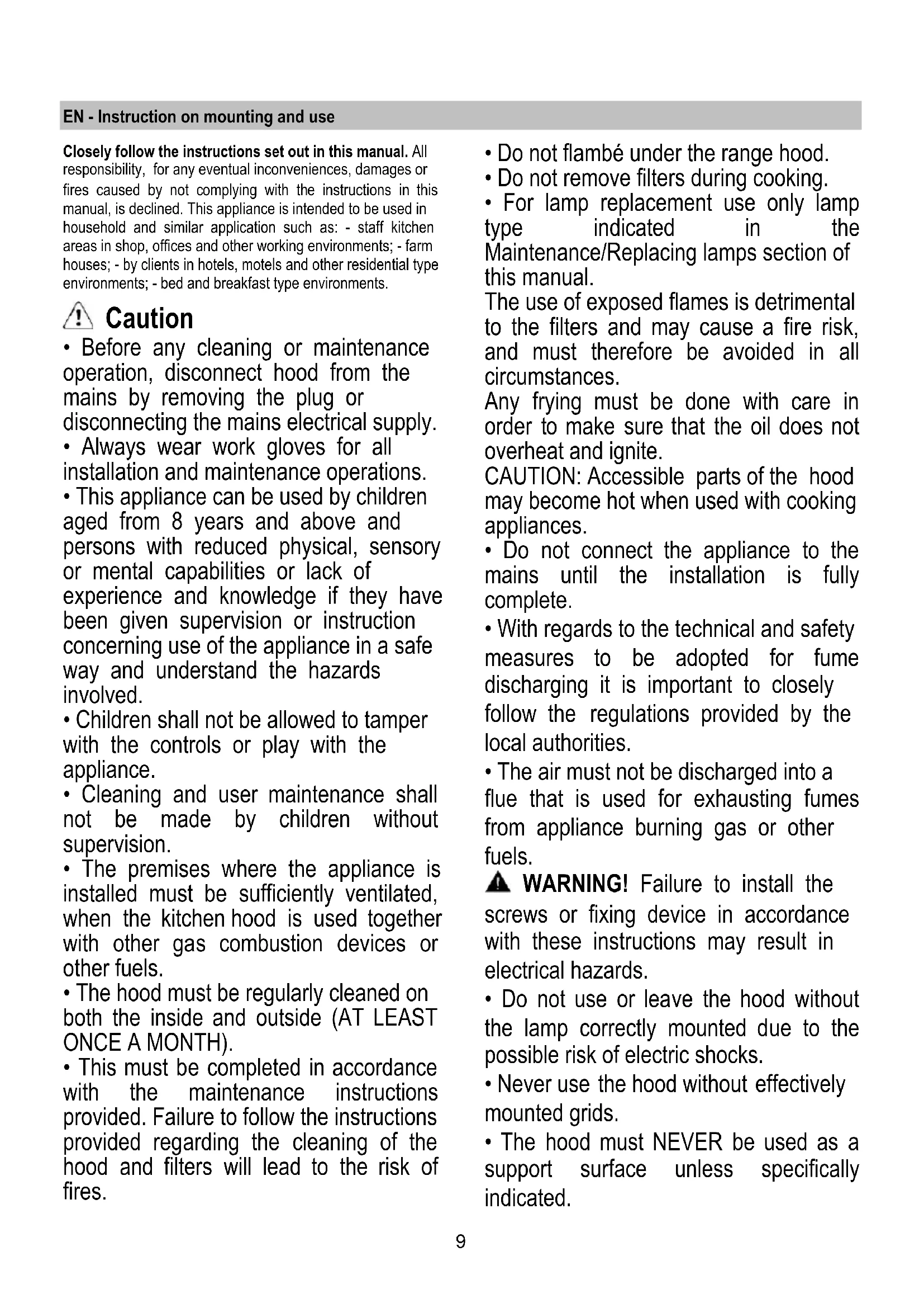 - This must be completed in accordance with the maintenance instructions provided. Failure to follow the instructions provided regarding the cleaning of the hood and filters will lead to the risk of fires.