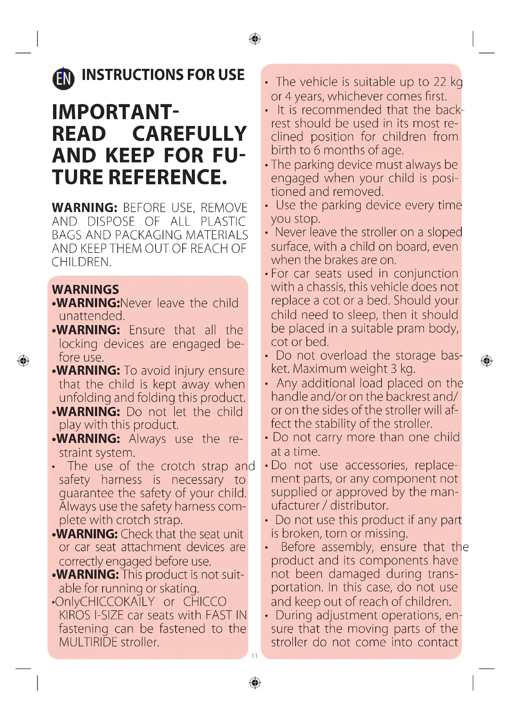 - Only CHICCO KAILY or CHICCO KIROS I-SIZE car seats with FAST IN fastening can be fastened to the MULTIRIDE stroller.