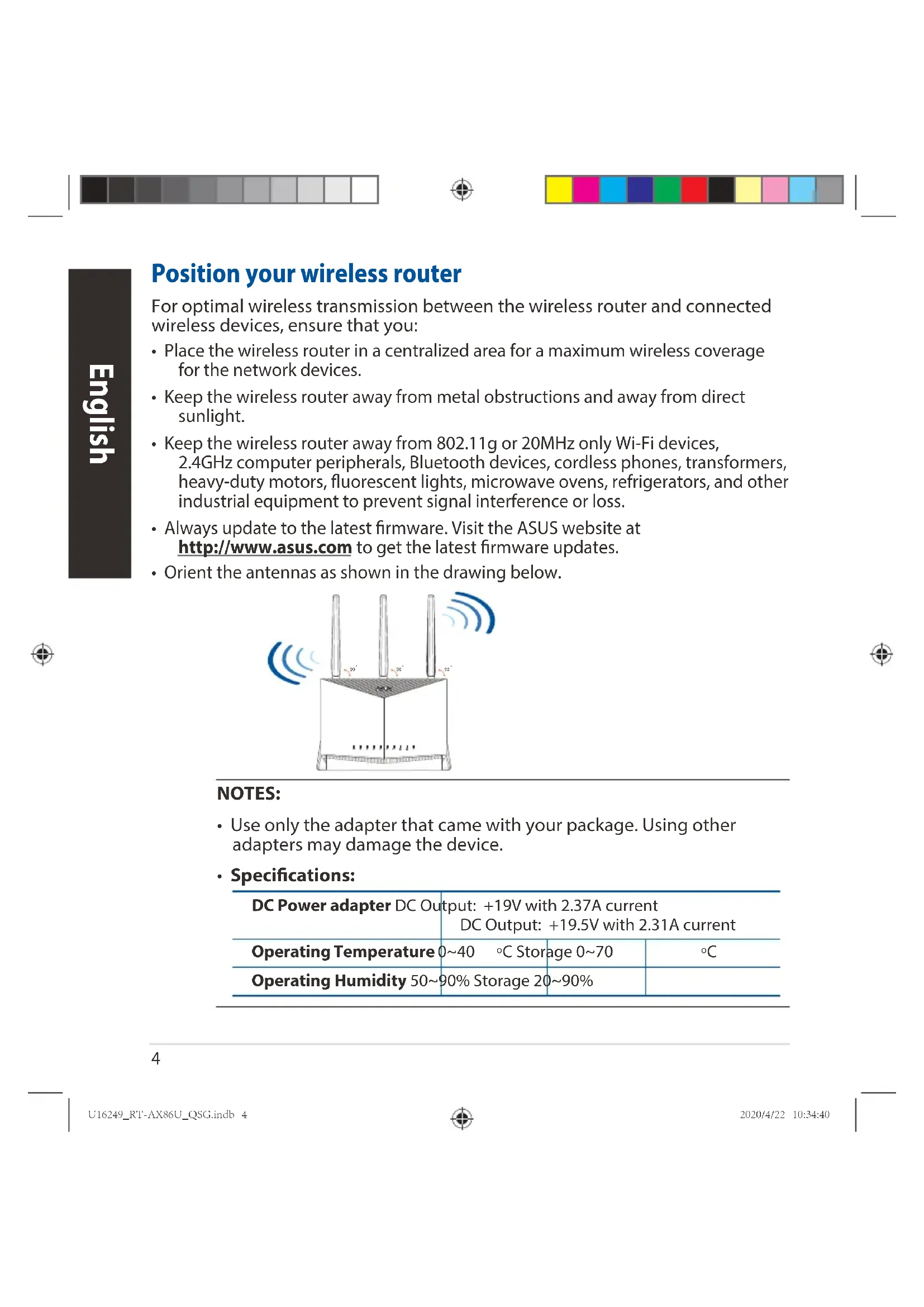 - DO NOT mount this equipment higher than 2 meters. CE statement Simplied EU Declaration of Conformity ASUSTek Computer Inc. hereby declares that this device is in compliance with the essential requirements and other relevant provisions of Directive 2014/53/EU. Full text of EU declaration of conformity is available at https://www.asus.com/Networking/RT-AX86U/HelpDesk/. Declaration of Conformity for Ecodesign directive 2009/125/EC Testing for eco-design requirements according to (EC) No 1275/2008 and (EU) No 801/2013 has been conducted. When the device is in Networked Standby Mode, its I/O and network interface are in sleep mode and may not work properly. To wake up the device, press the Wi-Fi on/o, LED on/o, reset, or WPS button. This equipment complies with EU radiation exposure limits set forth for an uncontrolled environment. This equipment should be installed and operated with minimum distance 20 cm between the radiator & your body. All operational modes: 2.4GHz: 802.11b, 802.11g, 802.11n (HT20), 802.11n (HT40), 802.11ac (VHT20), 802.11ac (VHT40), 802.11ax (HE20), 802.11ax (HE40) 5GHz: 802.11a, 802.11n (HT20), 802.11n (HT40), 802.11ac (VHT20), 802.11ac (VHT40), 802.11ac (VHT80), 802.11ac (VHT160), 802.11ax (HE20), 802.11ax (HE40), 802.11ax (HE80), 802.11ax (HE160) The frequency, channel and the maximum transmitted power in EU are listed below: 2400-2483.5MHz(1-13): OFDM: 19.97dBm(99.3mW); CCK: 19.73dBm(93.9mW) 5150-5250MHz (36-48): 22.98dBm(198mW) 5250-5350MHz (52-64): 22.99dBm(199mW) 5470-5725MHz (100-140): 29.98dBm(995mW) The device is restricted to indoor use only when operating in the 5150 to 5350 MHz frequency range. The adapter shall be installed near the equipment and shall be easily accessible. AT BE BG CZ DK EE FR DE IS IE IT EL ES CY LV LI LT LU HU MT NL NO PL PT RO SI SK TR FI SE CH UK HR UA U16249_RT-AX86U_QSG.indb 183U16249_RT-AX86U_QSG.indb 183 2020/4/22 10:35:362020/4/22 10:35:36184 Bulgarian Бележки за безопасност