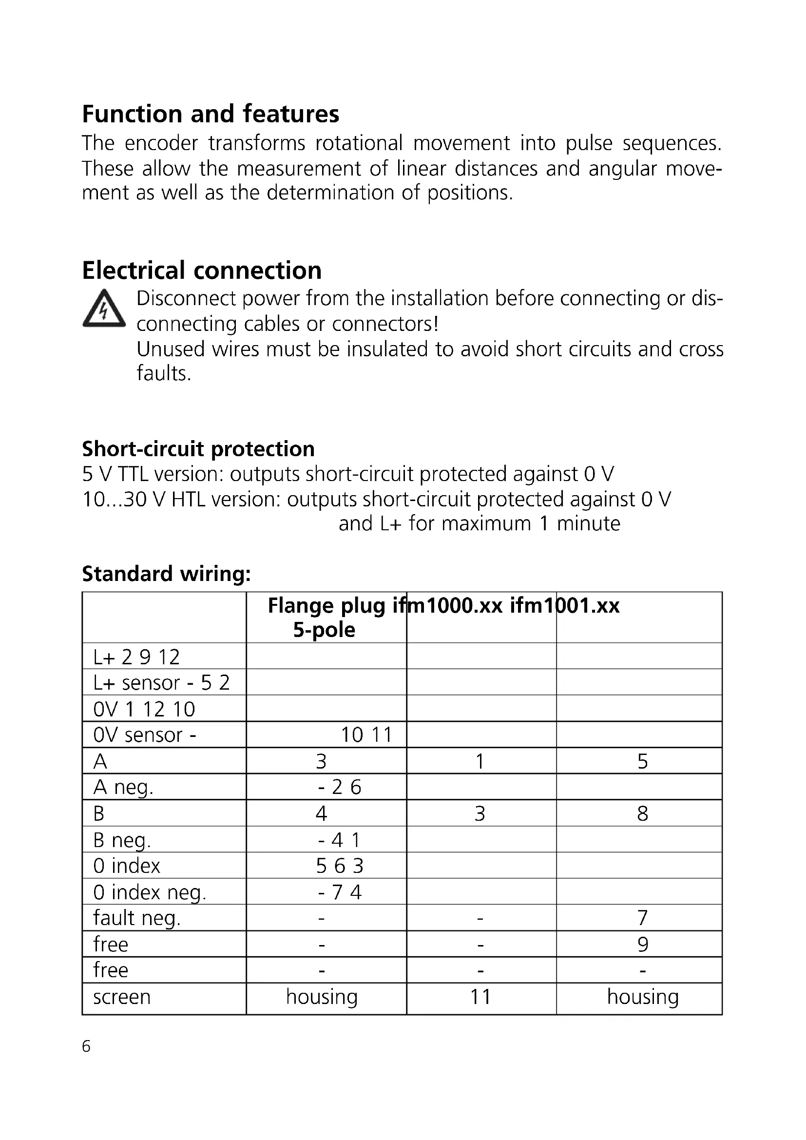 Flange plug ifm1000.xx ifm1001.xx 5-pole L+ 2 9 12 L+ sensor - 5 2 0V 1 12 10 0V sensor - 10 11 A315 A neg. - 2 6 B438 B neg. - 4 1 0 index 5 6 3 0 index neg. - 7 4 fault neg. - - 7 free - - 9 free - - - screen housing 11 housingWiring is also indicated on the housing cap. If there is a deviation, the encoder must be connected as indicated on the label on the housing cap. The wires L+ (sensor) and 0V (sensor) are internally connected to the supply voltage. When using external electronics which regulate the supply voltage these wires can be used as test wires. If unused, these wires must be connected to the supply voltage or insulated. Depending on the version, the electrical connection is made via the cable or via cables to be obtained separately. When using suitable cables the maximum cable length is 100 m for the 5 V TTL version and 300 m for the 10...30 V HTL version.