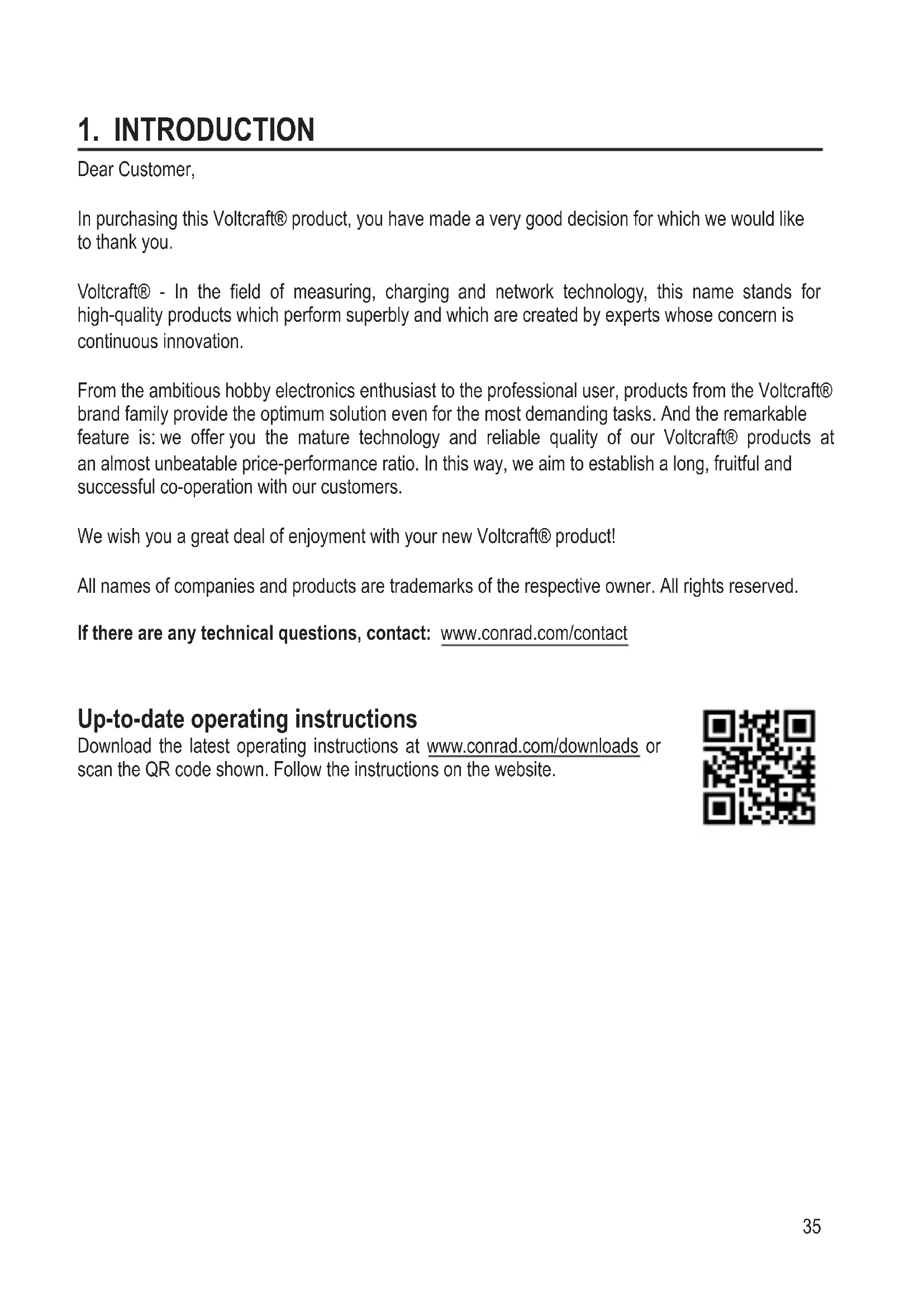 Dear Customer, In purchasing this Voltcraft® product, you have made a very good decision for which we would like to thank you. Voltcraft® - In the eld of measuring, charging and network technology, this name stands for high-quality products which perform superbly and which are created by experts whose concern is continuous innovation. From the ambitious hobby electronics enthusiast to the professional user, products from the Voltcraft® brand family provide the optimum solution even for the most demanding tasks. And the remarkable feature is: we offer you the mature technology and reliable quality of our Voltcraft® products at an almost unbeatable price-performance ratio. In this way, we aim to establish a long, fruitful and successful co-operation with our customers. We wish you a great deal of enjoyment with your new Voltcraft® product! All names of companies and products are trademarks of the respective owner. All rights reserved. If there are any technical questions, contact: www.conrad.com/contact Up-to-date operating instructions Download the latest operating instructions at www.conrad.com/downloads or scan the QR code shown. Follow the instructions on the website.36