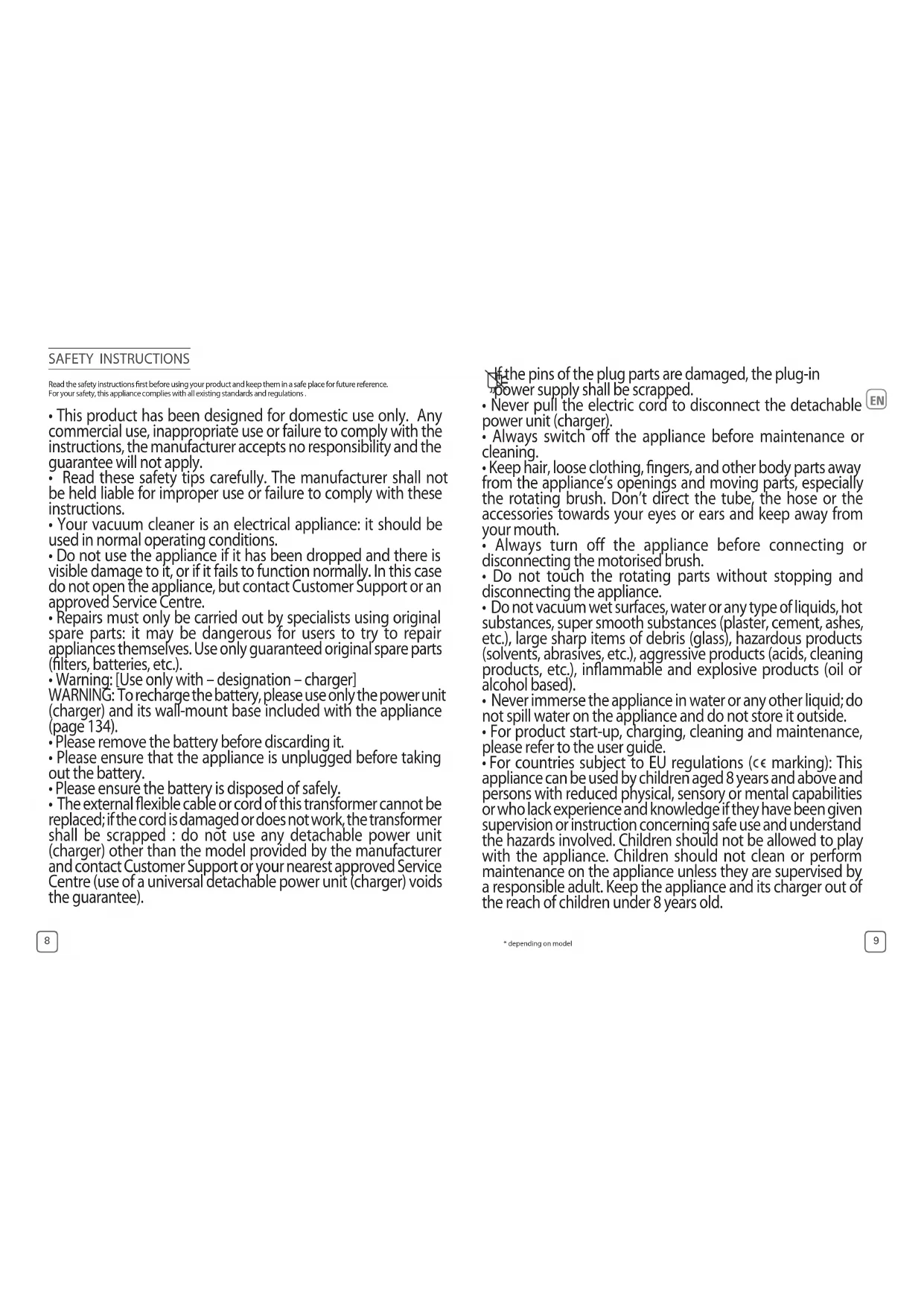 The charger becomes hot This is perfectly normal. The vacuum cleaner can remain permanently connected to the charger without any risk.The charger is connected but your appliance is not charging The charger is not properly connected to the appliance or is faulty. Check that the charger is properly connected or contact an Approved Service Centre to change the charger.Your appliance stops during operation and the charge light(s) ash(es) very quickly Your appliance may be overheating. Stop the appliance and leave it to cool down for at least 1hour.The charge light ashes and the appliance stops The appliance has lost its charge. Recharge the vacuum cleaner.The power-brush is not working properly or makes a noise The rotating brush or hose is obstructed.Stop the vacuum cleaner and clean them.The brush is worn.Contact an Approved Service Centre to change the brush.The belt is worn.Contact an Approved Service Centre to change the belt.The power-brush stops during use of the vacuum cleaner The heat safety device has come on.Stop the vacuum cleaner. Check that nothing is obstructing the rotation of the brush; if there is an obstruction, remove it and clean the power-brush, then turn on the vacuum cleaner.Your vacuum cleaner suction is not working properly or is making a whistling noise The tube or hose is partially blocked. Unblock them.The dust collector is full. Empty it and clean it.The dust collector is not properly tted. Re-position it correctly. The suction head is dirty. Remove the power-brush and clean it.The motor protection lter is full. Clean it.When the vacuum cleaner is charged, the charge light(s) ash(es) red or very quickly.The correct charger is not being used or the charger is faulty.Contact an Approved Service Centre to change the charger.The red LED on the product ashes during useThe suction head brush is blocked.Stop vacuuming and check that there is nothing blocking the rotation of the brush.The battery temperature is too high.Leave the product to rest for 30minutes. If the problem persists, replace the battery.The tube and/or suction head connectors are dirty or damaged.Clean the tube and suction head connectors with a cloth.The suction motor is not working.Contact an Approved Service Centre to have your appliance repaired. Please keep this user manual. ENVIRONMENT In accordance with existing regulation, any end-of-life appliances must be taken to an approved Service Centre which will take responsibility for managing their disposal. Let’s help protect the environment. Your device is designed to work for many years. But when you decide to replace it, don’t forget to think about how you can help protect the environment by allowing it to be reused, recycled or recovered in some other way. Waste electrical and electronic equipment may contain harmful substances that can cause harm to the environment and human health. This label indicates that this product must not be disposed of with household waste. Take it to a collection point, to the distributor when buying a new equivalent product, or an approved service center for processing. Before disposing of the device, remove the battery and dispose of it in accordance with local laws and local arrangements. If you have any questions, please contact your product dealer who can tell you what to do.DE
