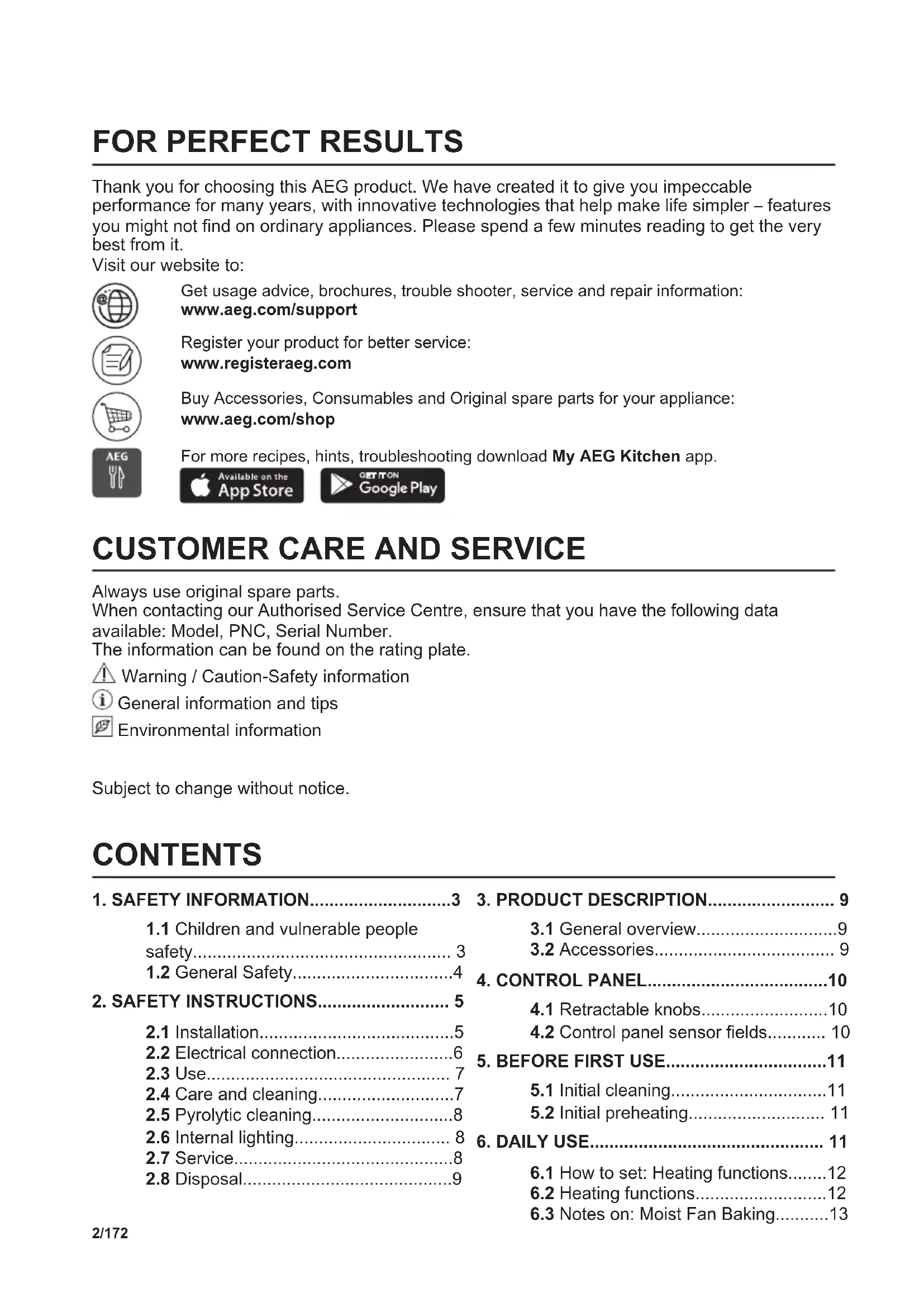 loading-circle-1FOR PERFECT RESULTS Thank you for choosing this AEG product. We have created it to give you impeccable performance for many years, with innovative technologies that help make life simpler – features you might not find on ordinary appliances. Please spend a few minutes reading to get the very best from it. Visit our website to: Get usage advice, brochures, trouble shooter, service and repair information: www.aeg.com/support Register your product for better service: www.registeraeg.com Buy Accessories, Consumables and Original spare parts for your appliance: www.aeg.com/shop For more recipes, hints, troubleshooting download My AEG Kitchen app.