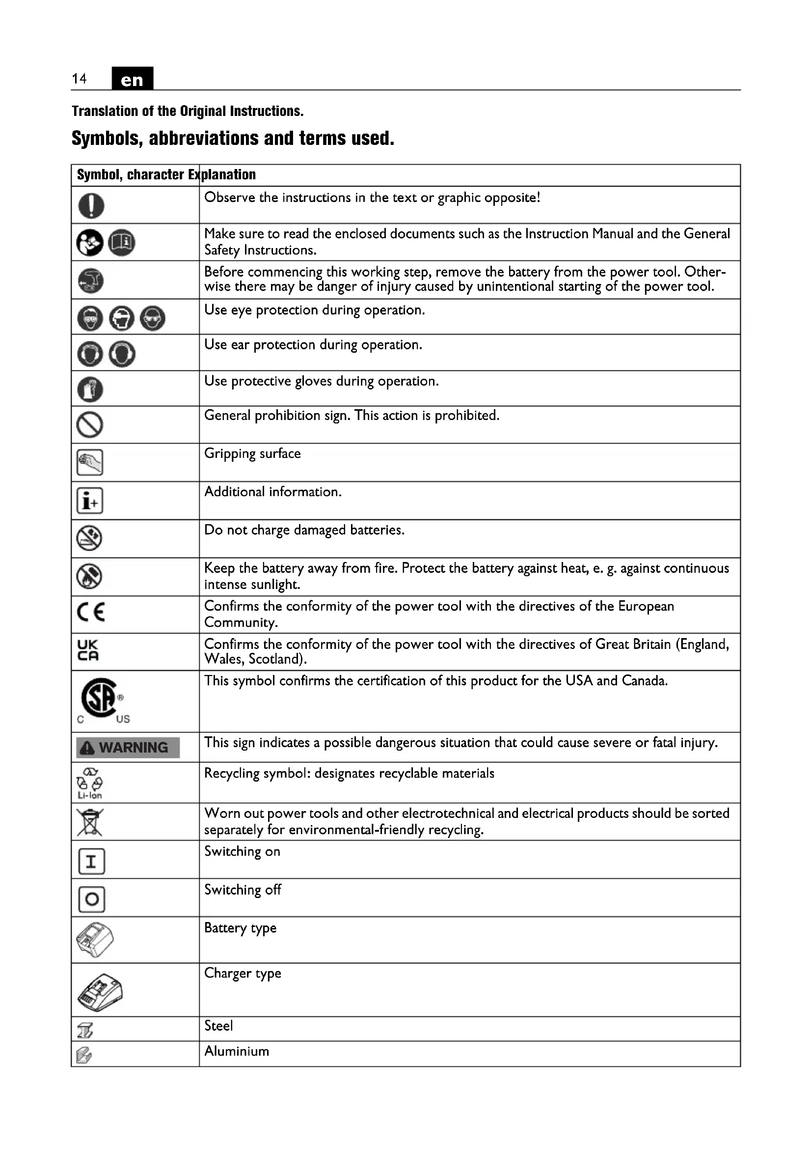 Translation of the Original Instructions. Symbols, abbreviations and terms used. Symbol, character Explanation Observe the instructions in the text or graphic opposite! Make sure to read the enclosed documents such as the Instruction Manual and the General Safety Instructions. Before commencing this working step, remove the battery from the power tool. Other- wise there may be danger of injury caused by unintentional starting of the power tool. Use eye protection during operation. Use ear protection during operation. Use protective gloves during operation. General prohibition sign. This action is prohibited. Gripping surface Additional information. Do not charge damaged batteries. Keep the battery away from fire. Protect the battery against heat, e. g. against continuous intense sunlight. Confirms the conformity of the power tool with the directives of the European Community. Confirms the conformity of the power tool with the directives of Great Britain (England, Wales, Scotland). This symbol confirms the certification of this product for the USA and Canada. This sign indicates a possible dangerous situation that could cause severe or fatal injury. Recycling symbol: designates recyclable materials Worn out power tools and other electrotechnical and electrical products should be sorted separately for environmental-friendly recycling. Switching on Switching off Battery type Charger type Steel Aluminium WARNING15
