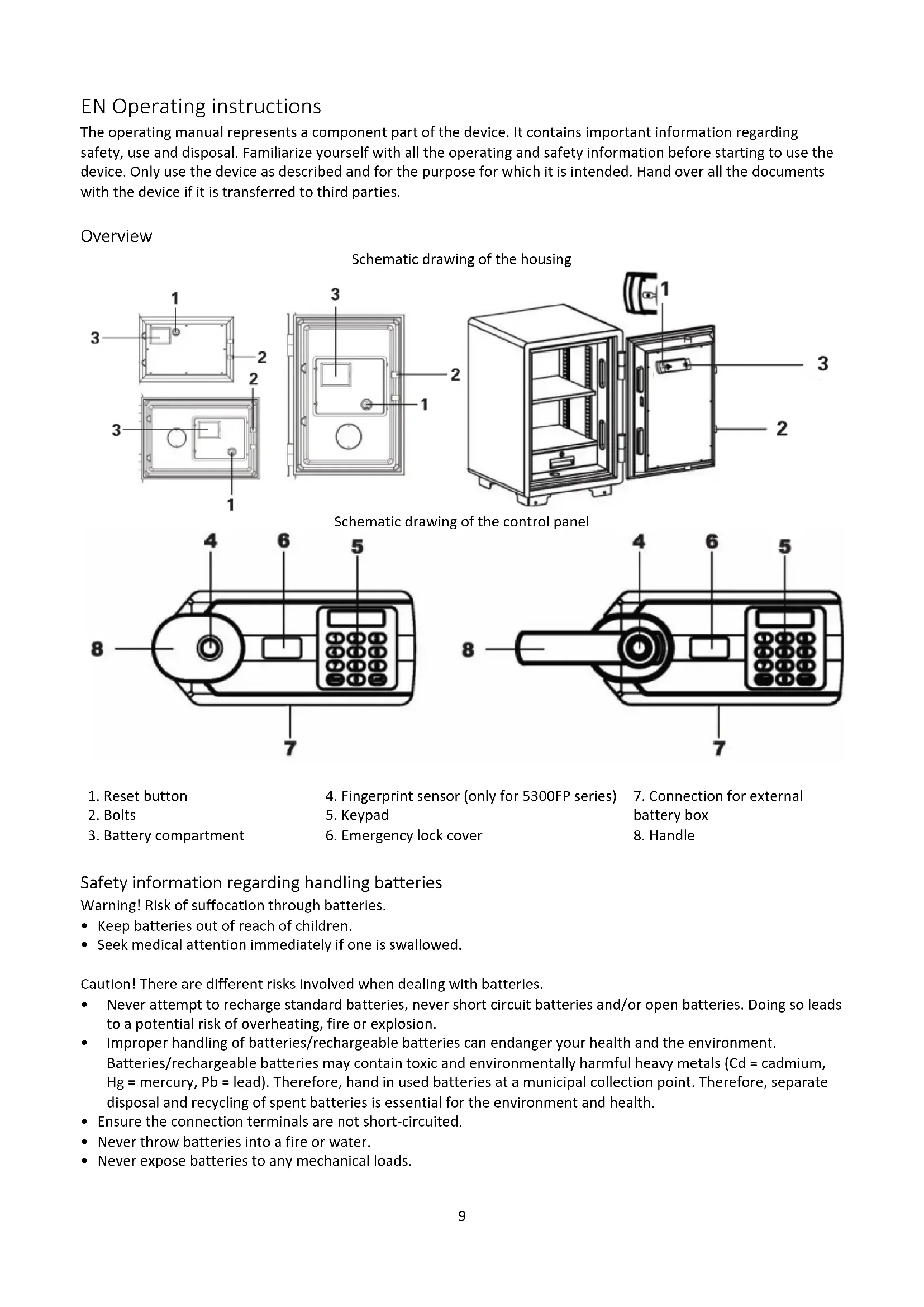 - You are legally obliged to dispose of batteries at your dealer or at the collection points provided by the responsible waste disposal authority. Package Contents Check the package contents of the safe before you actually use the safe. If anything is missing or damaged, contact our Service Department.
