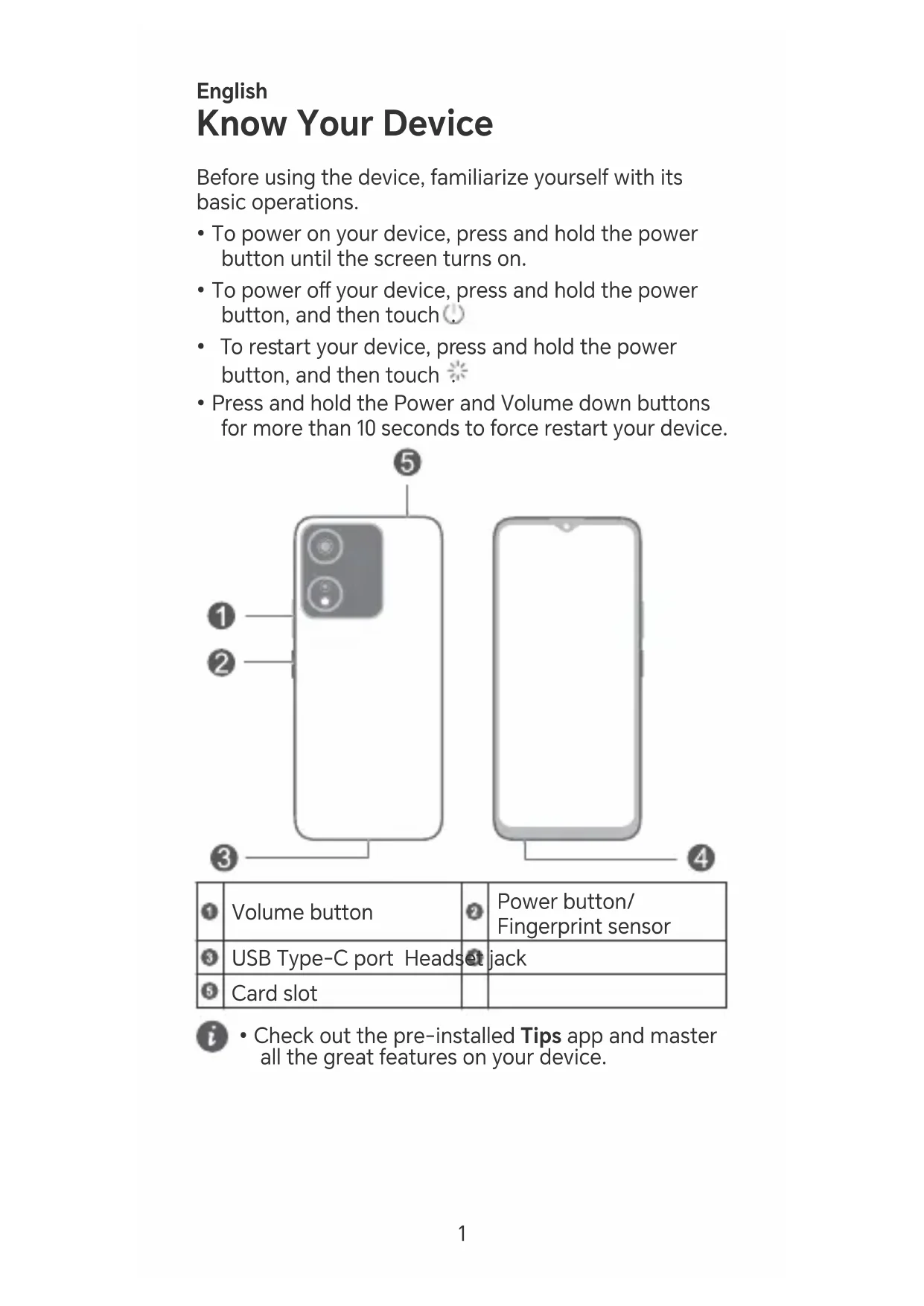 - Press and hold the Power and Volume down buttons for more than 10 seconds to force resta your device. Volume button Power button/ Fingerprint sensor USB Type-C po Headset jack Card slot