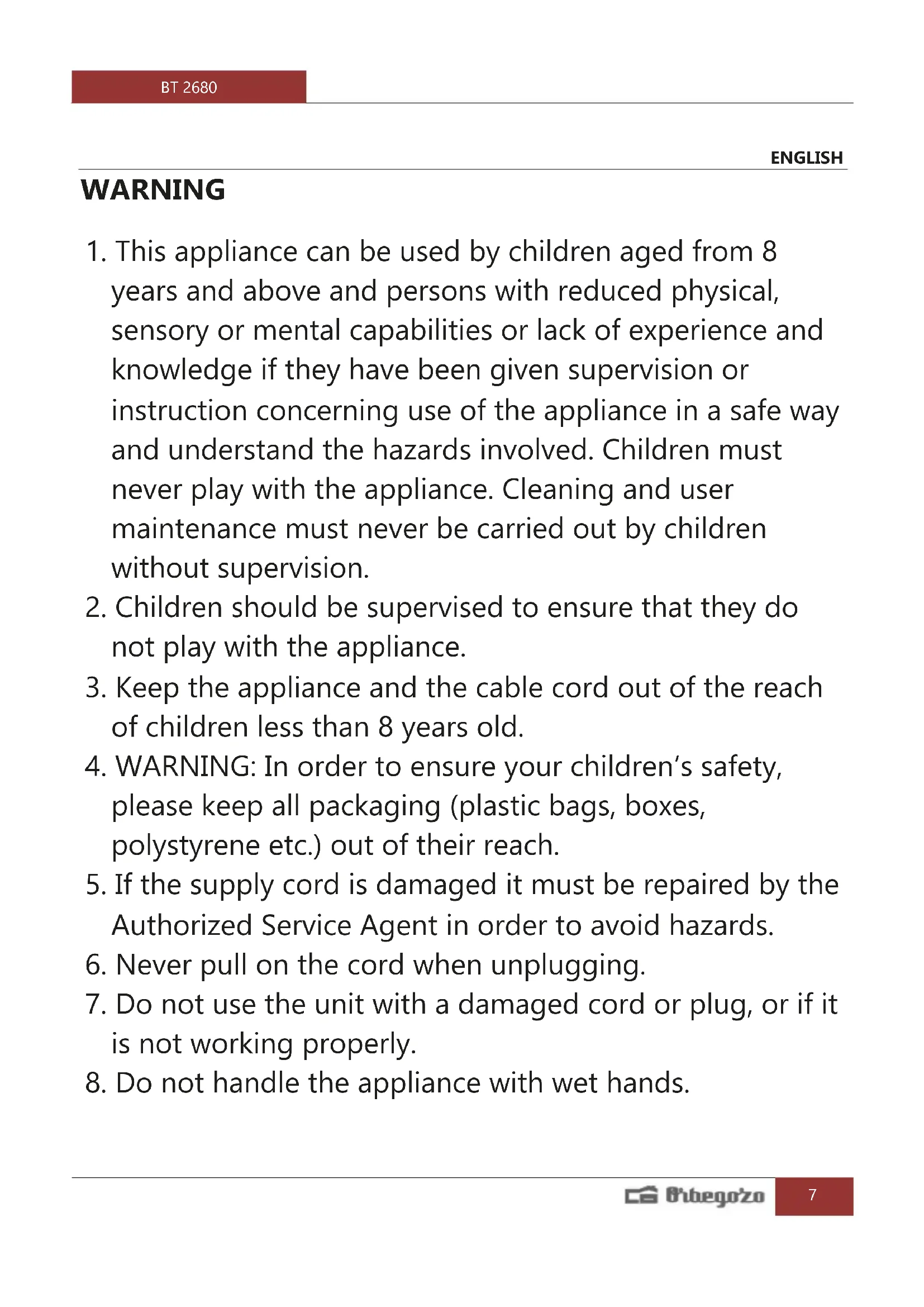 8. Do not handle the appliance with wet hands.BT 2680