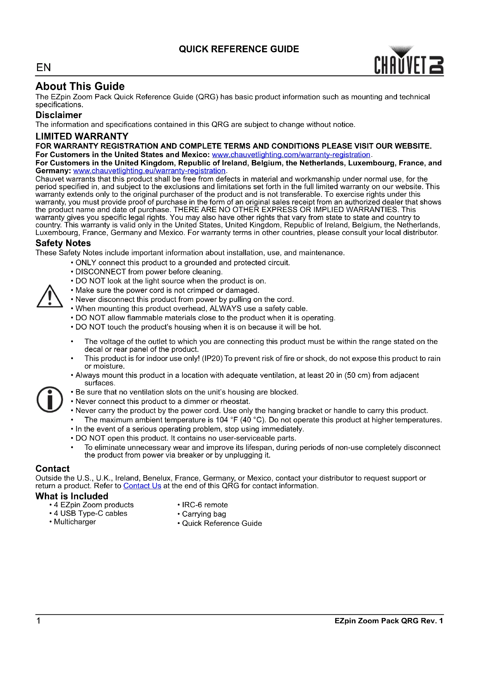 EZpin Zoom Pack QRG Rev. 1 About This Guide The EZpin Zoom Pack Quick Reference Guide (QRG) has basic product information such as mounting and technical specifications. Disclaimer The information and specifications contained in this QRG are subject to change without notice. LIMITED WARRANTY FOR WARRANTY REGISTRATION AND COMPLETE TERMS AND CONDITIONS PLEASE VISIT OUR WEBSITE. For Customers in the United States and Mexico: www.chauvetlighting.com/warranty-registration