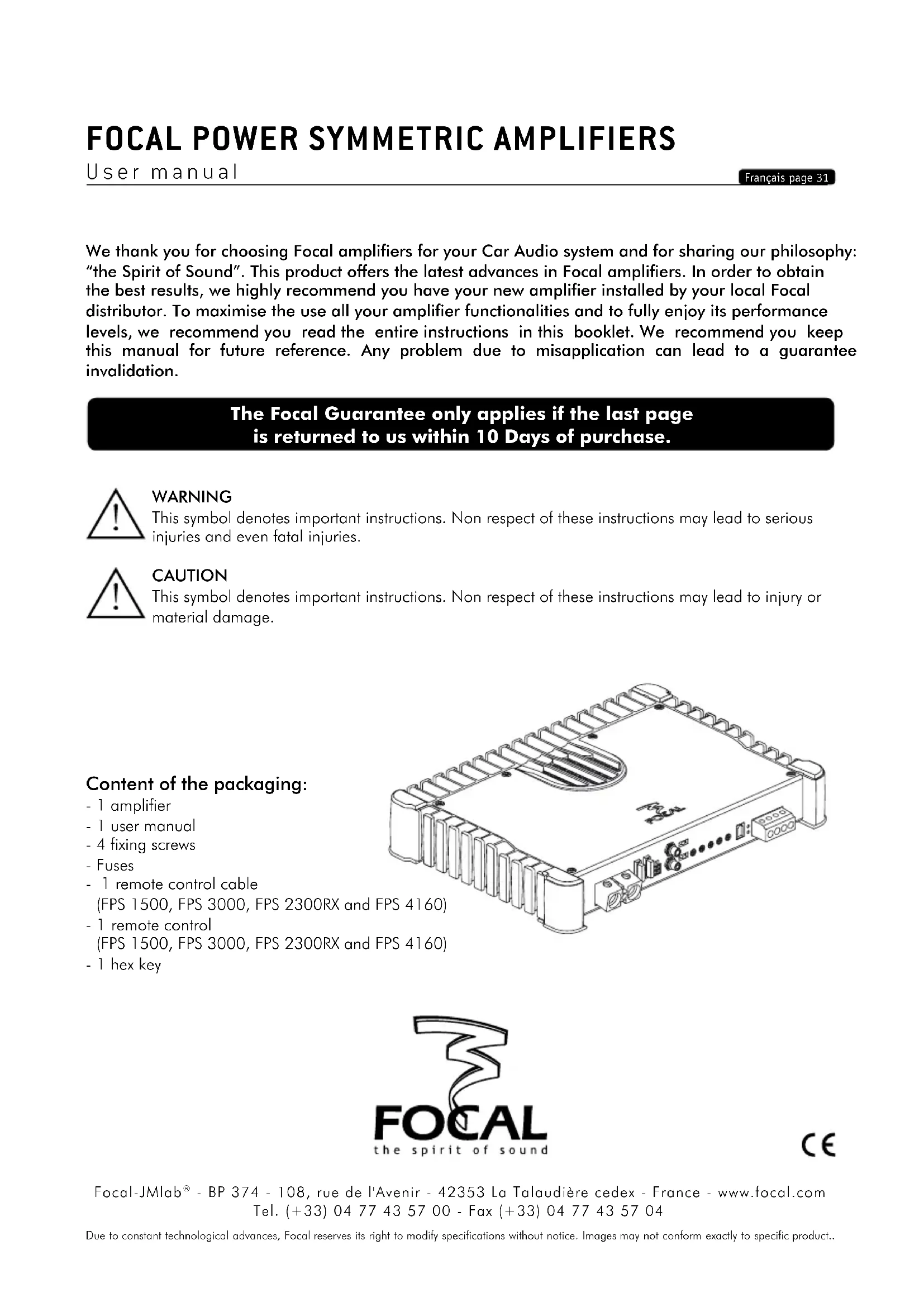 We thank you for choosing Focal amplifiers for your Car Audio system and for sharing our philosophy: “the Spirit of Sound”. This product offers the latest advances in Focal amplifiers. In order to obtain the best results, we highly recommend you have your new amplifier installed by your local Focal distributor. To maximise the use all your amplifier functionalities and to fully enjoy its performance levels, we recommend you read the entire instructions in this booklet. We recommend you keep this manual for future reference. Any problem due to misapplication can lead to a guarantee invalidation. The Focal Guarantee only applies if the last page is returned to us within 10 Days of purchase. WARNING This symbol denotes important instructions. Non respect of these instructions may lead to serious injuries and even fatal injuries. CAUTION This symbol denotes important instructions. Non respect of these instructions may lead to injury or material damage. Due to constant technological advances, Focal reserves its right to modify specifications without notice. Images may not conform exactly to specific product.. Content of the packaging: - 1 amplifier - 1 user manual - 4 fixing screws - Fuses - 1 remote control cable (FPS 1500, FPS 3000, FPS 2300RX and FPS 4160)