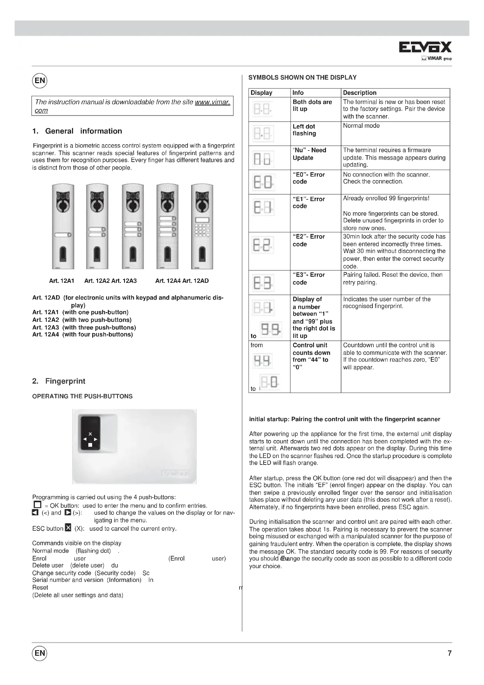 The instruction manual is downloadable from the site www.vimar. com initial startup: Pairing the control unit with the fingerprint scanner After powering up the appliance for the first time, the external unit display starts to count down until the connection has been completed with the ex- ternal unit. Afterwards two red dots appear on the display. During this time the LED on the scanner flashes red. Once the startup procedure is complete the LED will flash orange. After startup, press the OK button (one red dot will disappear) and then the ESC button. The initials “EF” (enrol finger) appear on the display. You can then swipe a previously enrolled finger over the sensor and initialisation takes place without deleting any user data (this does not work after a reset). Alternately, if no fingerprints have been enrolled, press ESC again. During initialisation the scanner and control unit are paired with each other. The operation takes about 1s. Pairing is necessary to prevent the scanner being misused or exchanged with a manipulated scanner for the purpose of gaining fraudulent entry. When the operation is complete, the display shows the message OK. The standard security code is 99. For reasons of security you should change the security code as soon as possible to a different code your choice. EN8 OVERVIEW OF THE PROGRAMMING MENU: You can access the lower menu level by pressing the OK button. You can return to the previous menu by pressing the ESC button. You can navigate by pressing the < and > buttons.
