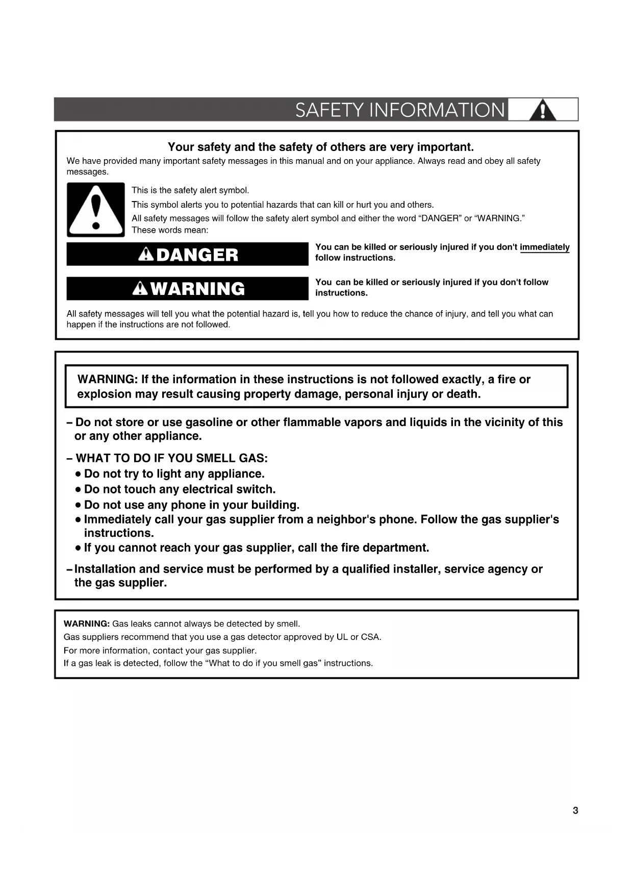 Installation and service must be performed by a qualified installer, service agency or the gas supplier. WARNING: Gas leaks cannot always be detected by smell.Gas suppliers recommend that you use a gas detector approved by UL or CSA.For more information, contact your gas supplier.If a gas leak is detected, follow the “What to do if you smell gas” instructions. SAFETY INFORMATION4