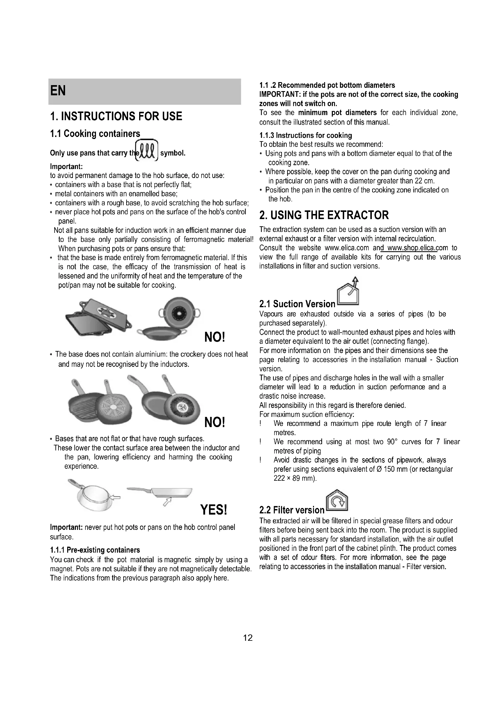 The extraction system can be used as a suction version with an external exhaust or a filter version with internal recirculation. Consult the website www.elica.com and www.shop.elica.com to view the full range of available kits for carrying out the various installations in filter and suction versions.