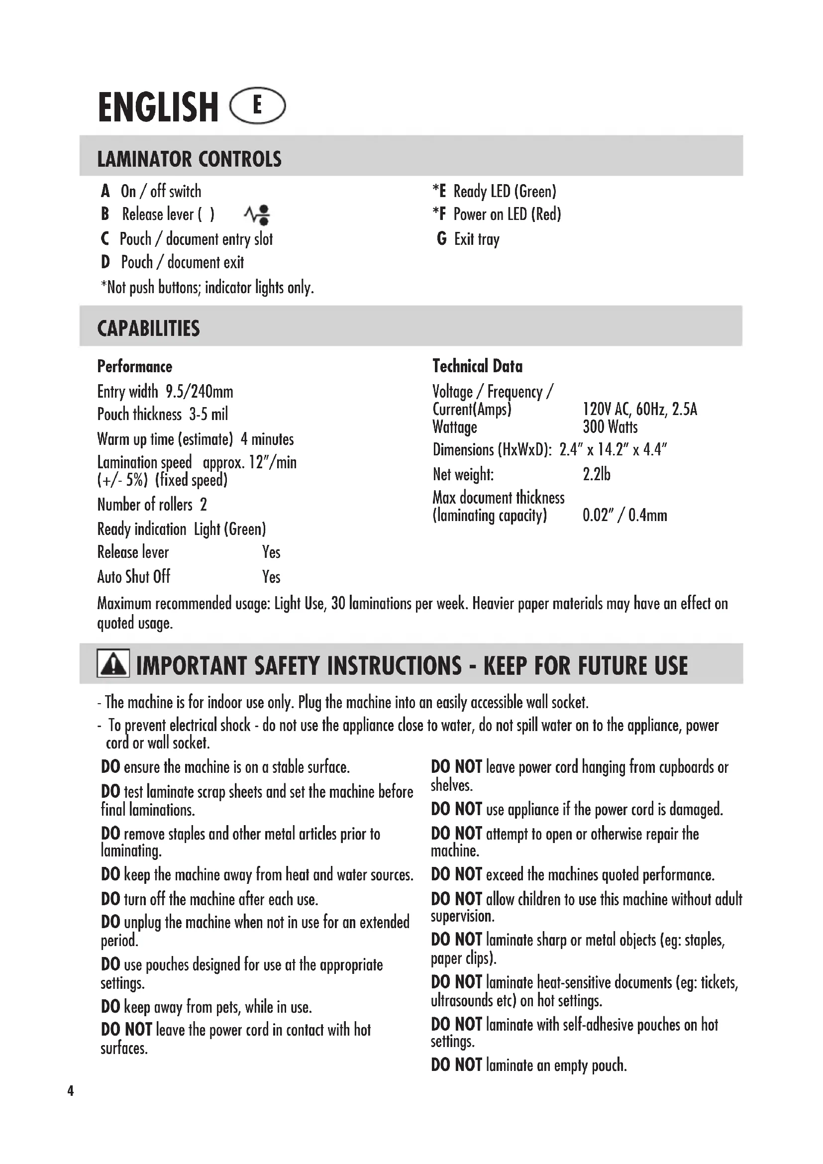 A On / off switch B Release lever ( ) C Pouch / document entry slot D Pouch / document exit *E Ready LED (Green) *F Power on LED (Red) G Exit tray *Not push buttons; indicator lights only. CAPABILITIES - The machine is for indoor use only. Plug the machine into an easily accessible wall socket. - To prevent electrical shock - do not use the appliance close to water, do not spill water on to the appliance, power cord or wall socket. Maximum recommended usage: Light Use, 30 laminations per week. Heavier paper materials may have an effect on quoted usage. DO ensure the machine is on a stable surface. DO test laminate scrap sheets and set the machine before final laminations. DO remove staples and other metal articles prior to laminating. DO keep the machine away from heat and water sources. DO turn off the machine after each use. DO unplug the machine when not in use for an extended period. DO use pouches designed for use at the appropriate settings. DO keep away from pets, while in use. DO NOT leave the power cord in contact with hot surfaces.