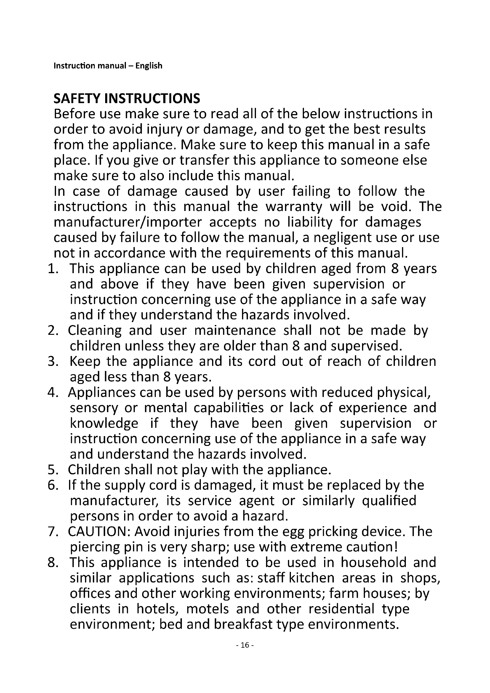 Fill the heating plate with the required amount of cold water, using the measuring cup. The graduations on the measuring cup correspond to the amount of water required to obtain 1 to 7 soft, medium or hard-boiled eggs. The graduations are given for medium-sized eggs. If the eggs are too soft, add a little more water than indicated on the cup, or less water if the eggs get too hard. Pierce the blunt end of the eggs with the egg piercer which is integrated in the egg tray. Put the eggs into the egg tray and close the lid. Plug in the egg boiler. A buzzer sounds when the eggs are ready. Disconnect the egg boiler from the wall socket. Take off the lid. Remove the egg tray from the heating plate and run the eggs under cold tap water. CLEANING INSTRUCTIONS Always unplug the appliance and allow cooling before cleaning. The egg tray and the cover can be washed normally. However, the heating plate which is fixed to the bottom of the appliance can only be cleaned with a moistened towel. Do not immerse the appliance in water! When excessive scales are deposited on the heating plate, normal household vinegar can be used to remove the scales. Dilute the vinegar with water (add 1 part vinegar to 10 parts of water). Pour the solution onto the heating plate. Allow soaking for about 30 minutes. Then pour away the liquid. Wipe the heating plate clean with a moistened towel. SAFETY MEASURES The appliance should not be used when: