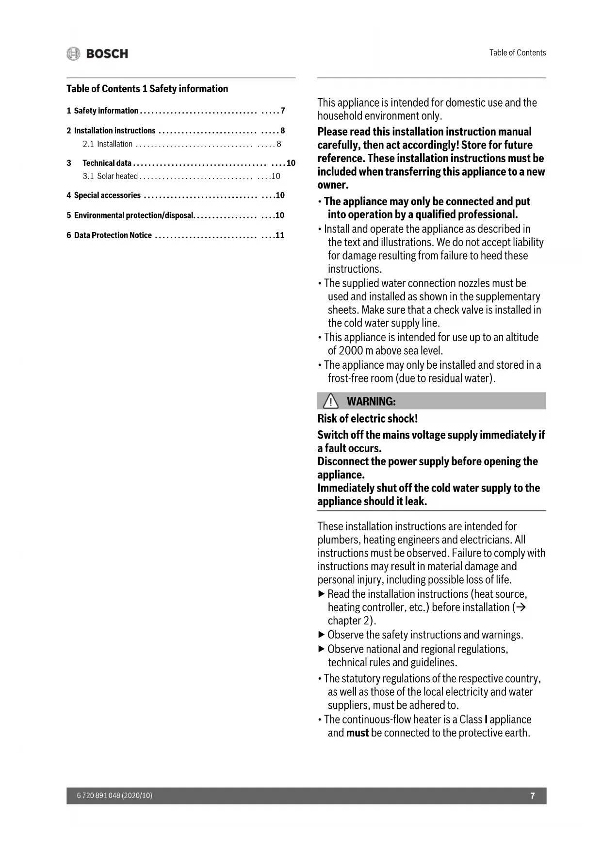 6 720 891 048 (2020/10) Table of Contents 1 Safety information This appliance is intended for domestic use and the household environment only. Please read this installation instruction manual carefully, then act accordingly! Store for future reference. These installation instructions must be included when transferring this appliance to a new owner.