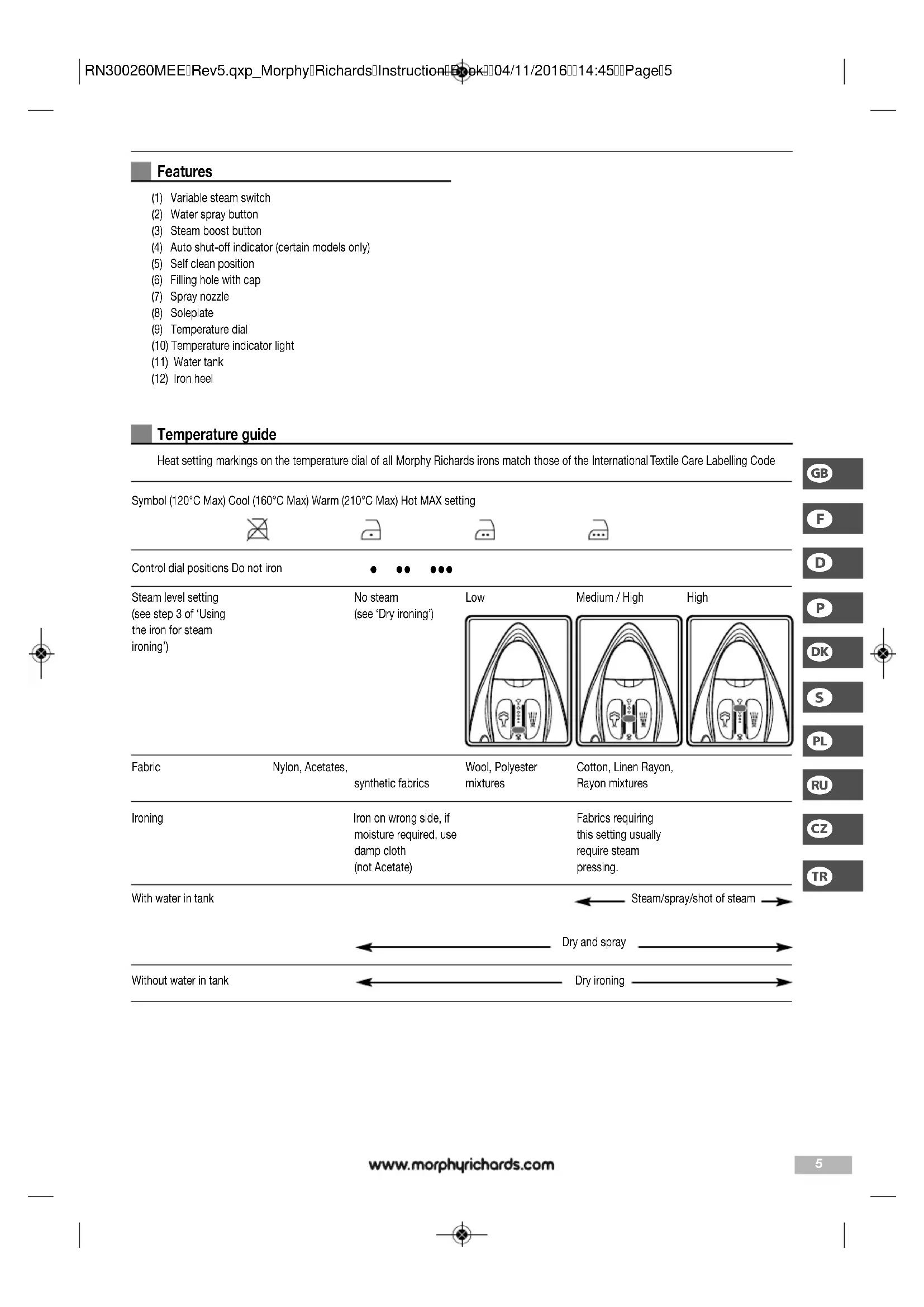 Fabric Nylon, Acetates, synthetic fabrics Wool, Polyester mixtures Cotton, Linen Rayon, Rayon mixtures Ironing Iron on wrong side, if moisture required, use damp cloth (not Acetate) Fabrics requiring this setting usually require steam pressing. Steam level setting (see step 3 of ‘Using the iron for steam ironing’) No steam (see ‘Dry ironing’) Low Medium / High High With water in tank Dry and spray Steam/spray/shot of steam Without water in tank Dry ironing Temperature guide Heat setting markings on the temperature dial of all Morphy Richards irons match those of the International Textile Care Labelling Code RN300260MEERev5.qxp_MorphyRichardsInstructionBook04/11/201614:45Page5Before use Remove any protective cover from the soleplate (8). Using the iron for steam ironing
