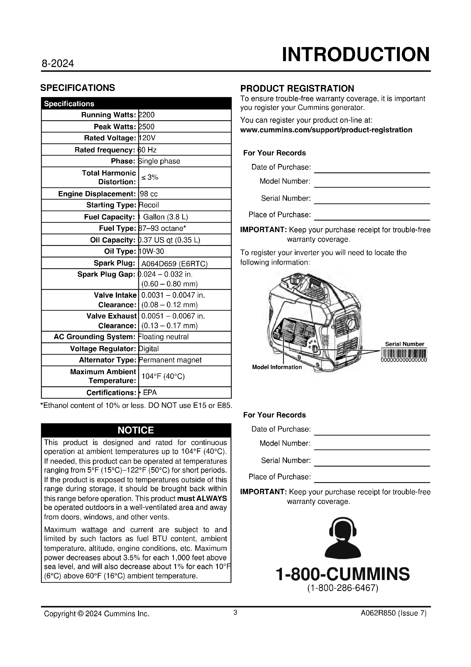 - FRANÇAIS Copyright © 2024 Cummins Inc. A062R850 (Issue 7) 8-2024 INTRODUCTION SPECIFICATIONSSpecicationsRunning Watts: 2200Peak Watts: 2500Rated Voltage: 120VRated frequency: 60 Hz Phase: Single phaseTotal Harmonic Distortion: ≤ 3% Engine Displacement: 98 ccStarting Type: Recoil Fuel Capacity: 1 Gallon (3.8 L)Fuel Type: 87–93 octane*Oil Capacity: 0.37 US qt (0.35 L)Oil Type: 10W-30Spark Plug:A064D659 (E6RTC)Spark Plug Gap: 0.024 – 0.032 in. (0.60 – 0.80 mm)Valve Intake Clearance:0.0031 – 0.0047 in. (0.08 – 0.12 mm)Valve Exhaust Clearance:0.0051 – 0.0067 in. (0.13 – 0.17 mm)AC Grounding System: Floating neutralVoltage Regulator: DigitalAlternator Type: Permanent magnetMaximum Ambient Temperature:104°F (40°C)Certications: • EPA*Ethanol content of 10% or less. DO NOT use E15 or E85.PRODUCT REGISTRATIONTo ensure trouble-free warranty coverage, it is important you register your Cummins generator. You can register your product on-line at: www.cummins.com/support/product-registration For Your RecordsDate of Purchase:Model Number:Serial Number:Place of Purchase:IMPORTANT: Keep your purchase receipt for trouble-free warranty coverage.To register your inverter you will need to locate the following information: Model Information000000000000000Serial NumberFor Your RecordsDate of Purchase:Model Number:Serial Number:Place of Purchase:IMPORTANT: Keep your purchase receipt for trouble-free warranty coverage. 1-800-CUMMINS (1-800-286-6467) NOTICE This product is designed and rated for continuous operation at ambient temperatures up to 104°F (40°C). If needed, this product can be operated at temperatures ranging from 5°F (15°C)–122°F (50°C) for short periods. If the product is exposed to temperatures outside of this range during storage, it should be brought back within this range before operation. This product must ALWAYS be operated outdoors in a well-ventilated area and away from doors, windows, and other vents. Maximum wattage and current are subject to and limited by such factors as fuel BTU content, ambient temperature, altitude, engine conditions, etc. Maximum power decreases about 3.5% for each 1,000 feet above sea level, and will also decrease about 1% for each 10°F (6°C) above 60°F (16°C) ambient temperature.8-2024 Copyright © 2024 Cummins Inc. A062R850 (Issue 7) SAFETY SAFETY SAFETY DEFINITIONSThe words DANGER, WARNING, CAUTION and NOTICE are used throughout this manual to highlight important information. Make sure that the meanings of this safety information is known to all who operate, perform maintenance on, or are near the generator.This safety alert symbol appears with most safety statements. It means attention, be alert, your safety is involved! Please read and follow the message that follows the safety alerts symbol. DANGER Indicates a hazardous situation which, if not avoided, will result in death or serious injury. WARNING Indicates a hazardous situation which, if not avoided, could result in death or serious injury. CAUTION Indicates a hazardous situation which, if not avoided, could result in minor or moderate injury.NOTICEIndicates a situation which can cause damage to the generator, personal property, and/or the environment, or cause the equipment to operate improperly.Note: Indicates a procedure, practice or condition that should be followed for the generator to function in the manner intended.SAFETY SYMBOLSFollow all safety information contained in this manual and on the generator. Symbol DescriptionSafety Alert SymbolElectrocution HazardAsphyxiation HazardBurn Hazard. DO NOT touch hot surfaces. Electrical Shock HazardFire HazardMaintain Safe Distance Lifting HazardRead Manufacturer’s InstructionsDo Not Operate in Wet ConditionsCopyright © 2024 Cummins Inc. A062R850 (Issue 7) 8-2024 SAFETY SAFETY INSTRUCTIONSLiving AreaBasement CrawlspaceEntrywayPorchMud RoomGarageCO Detectorsin living areasOnly use OUTSIDE and FAR AWAY from windows, doors, and vents. p. 56