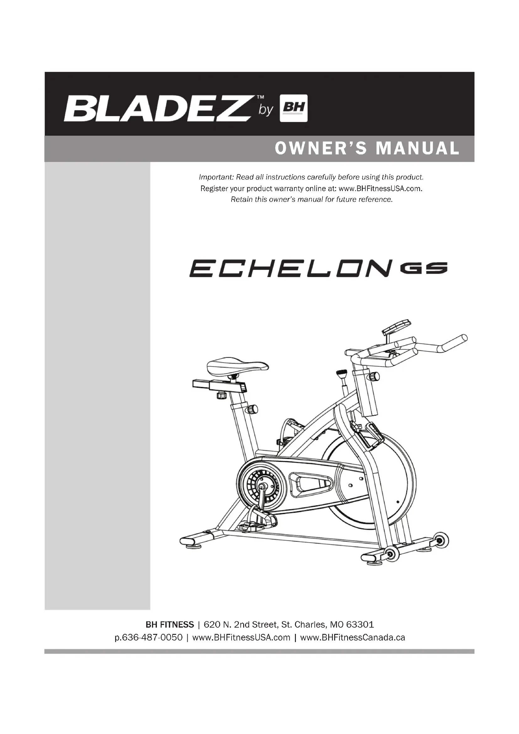 BH FITNESS | 620 N. 2nd Street, St. Charles, MO 63301 p.636-487-0050 | www.BHFitnessUSA.com | www.BHFitnessCanada.ca Important: Read all instructions carefully before using this product. Register your product warranty online at: www.BHFitnessUSA.com. Retain this owner’s manual for future reference.Register your product warranty online at: www.BHFitnessUSA.com Questions regarding warranty and parts call: 636.634.2217