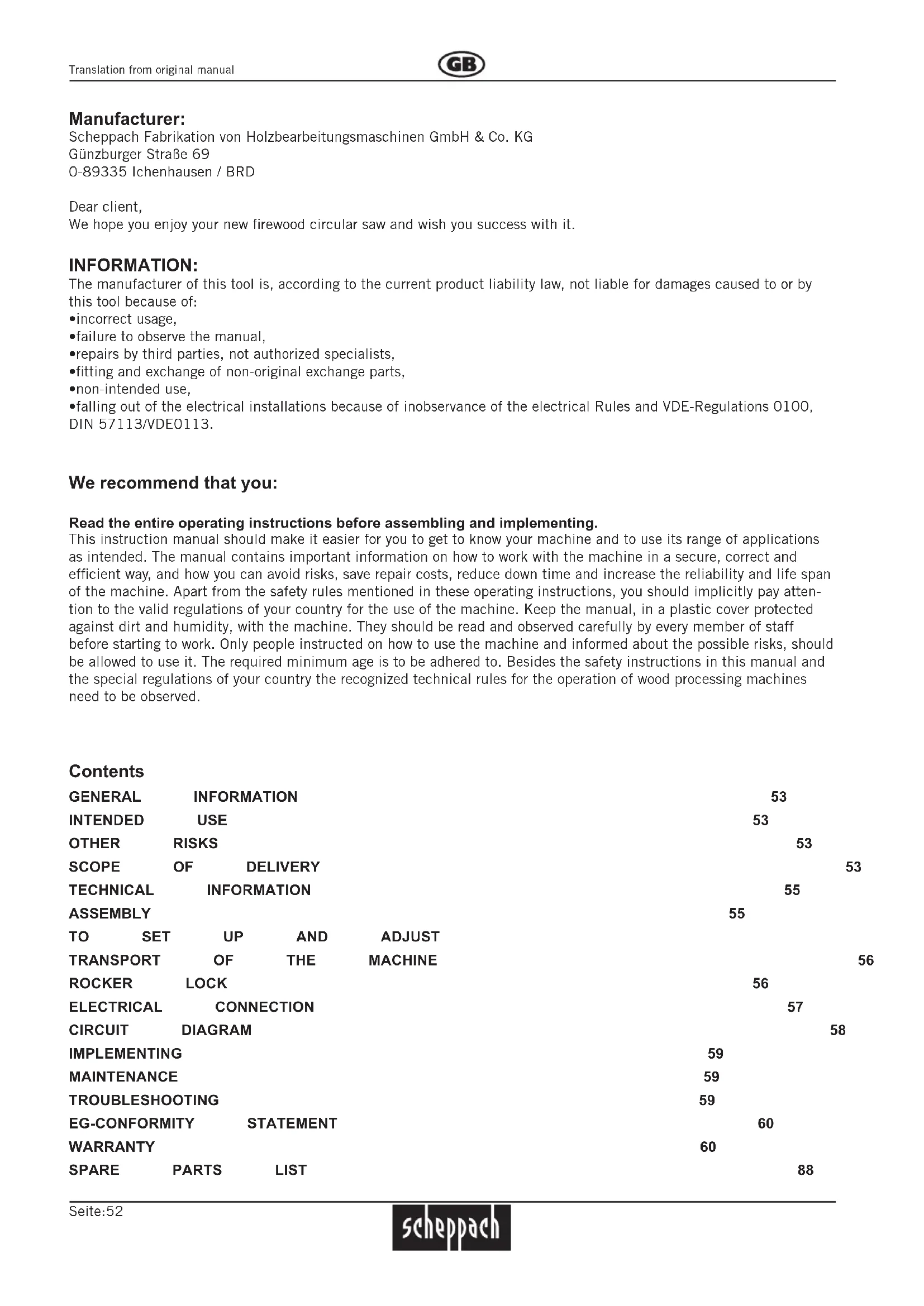 - falling out of the electrical installations because of inobservance of the electrical Rules and VDE-Regulations 0100, DIN 57113/VDE0113. We recommend that you: Read the entire operating instructions before assembling and implementing. This instruction manual should make it easier for you to get to know your machine and to use its range of applications as intended. The manual contains important information on how to work with the machine in a secure, correct and efficient way, and how you can avoid risks, save repair costs, reduce down time and increase the reliability and life span of the machine. Apart from the safety rules mentioned in these operating instructions, you should implicitly pay atten- tion to the valid regulations of your country for the use of the machine. Keep the manual, in a plastic cover protected against dirt and humidity, with the machine. They should be read and observed carefully by every member of staff before starting to work. Only people instructed on how to use the machine and informed about the possible risks, should be allowed to use it. The required minimum age is to be adhered to. Besides the safety instructions in this manual and the special regulations of your country the recognized technical rules for the operation of wood processing machines need to be observed. Contents GENERAL INFORMATION 53 INTENDED USE 53 OTHER RISKS 53