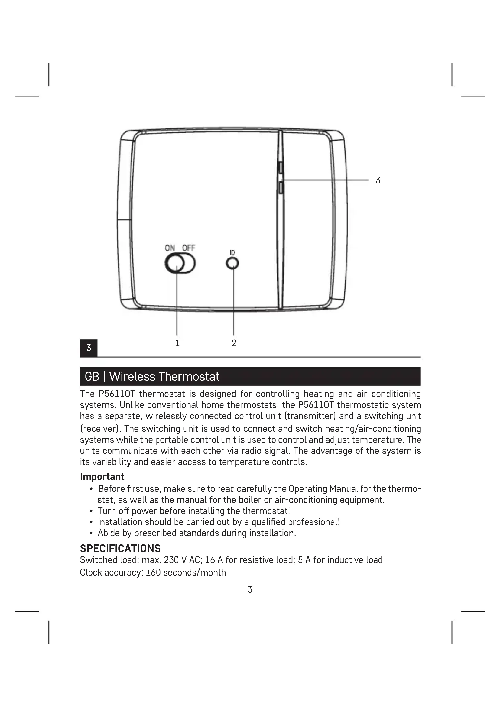 GB | Wireless Thermostat The P5611OT thermostat is designed for controlling heating and air-conditioning systems. Unlike conventional home thermostats, the P5611OT thermostatic system has a separate, wirelessly connected control unit (transmitter) and a switching unit (receiver). The switching unit is used to connect and switch heating/air-conditioning systems while the portable control unit is used to control and adjust temperature. The units communicate with each other via radio signal. The advantage of the system is its variability and easier access to temperature controls. Important