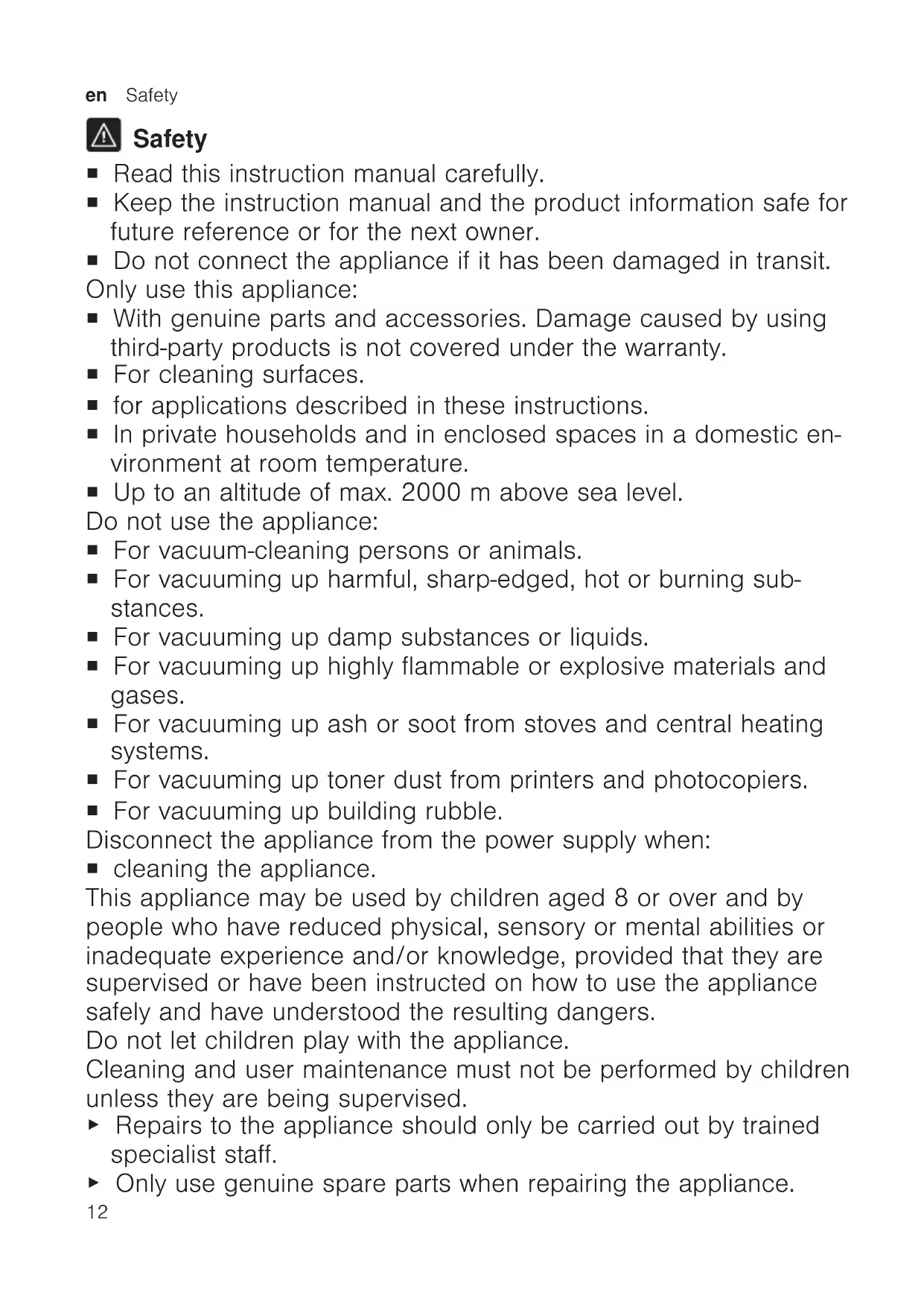 Safety ¡ Read this instruction manual carefully. ¡ Keep the instruction manual and the product information safe for future reference or for the next owner. ¡ Do not connect the appliance if it has been damaged in transit. Only use this appliance: ¡ With genuine parts and accessories. Damage caused by using third-party products is not covered under the warranty. ¡ For cleaning surfaces. ¡ for applications described in these instructions. ¡ In private households and in enclosed spaces in a domestic en- vironment at room temperature. ¡ Up to an altitude of max. 2000m above sea level. Do not use the appliance: ¡ For vacuum-cleaning persons or animals. ¡ For vacuuming up harmful, sharp-edged, hot or burning sub- stances. ¡ For vacuuming up damp substances or liquids. ¡ For vacuuming up highly flammable or explosive materials and gases. ¡ For vacuuming up ash or soot from stoves and central heating systems. ¡ For vacuuming up toner dust from printers and photocopiers. ¡ For vacuuming up building rubble. Disconnect the appliance from the power supply when: ¡ cleaning the appliance. This appliance may be used by children aged 8 or over and by people who have reduced physical, sensory or mental abilities or inadequate experience and/or knowledge, provided that they are supervised or have been instructed on how to use the appliance safely and have understood the resulting dangers. Do not let children play with the appliance. Cleaning and user maintenance must not be performed by children unless they are being supervised. ▶ Repairs to the appliance should only be carried out by trained specialist staff. ▶ Only use genuine spare parts when repairing the appliance.Safety en
