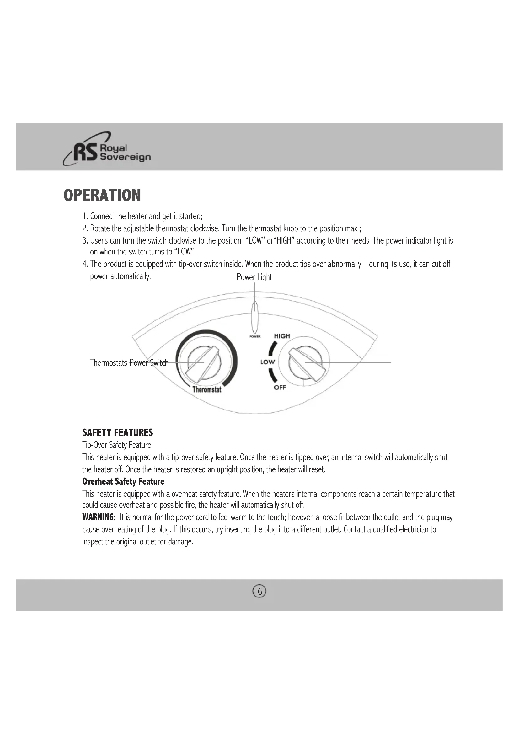 3. Users can turn the switch clockwise to the position “LOW” or“HIGH” according to their needs. The power indicator light is on when the switch turns to “LOW”; 4. The product is equipped with tip-over switch inside. When the product tips over abnormally during its use, it can cut off power automatically. SAFETY FEATURES Tip-Over Safety Feature This heater is equipped with a tip-over safety feature. Once the heater is tipped over, an internal switch will automatically shut the heater off. Once the heater is restored an upright position, the heater will reset. Overheat Safety Feature This heater is equipped with a overheat safety feature. When the heaters internal components reach a certain temperature that could cause overheat and possible fire, the heater will automatically shut off. WARNING: It is normal for the power cord to feel warm to the touch; however, a loose fit between the outlet and the plug may cause overheating of the plug. If this occurs, try inserting the plug into a different outlet. Contact a qualified electrician to inspect the original outlet for damage. Thermostats Power Switch Power LightHIR-22T