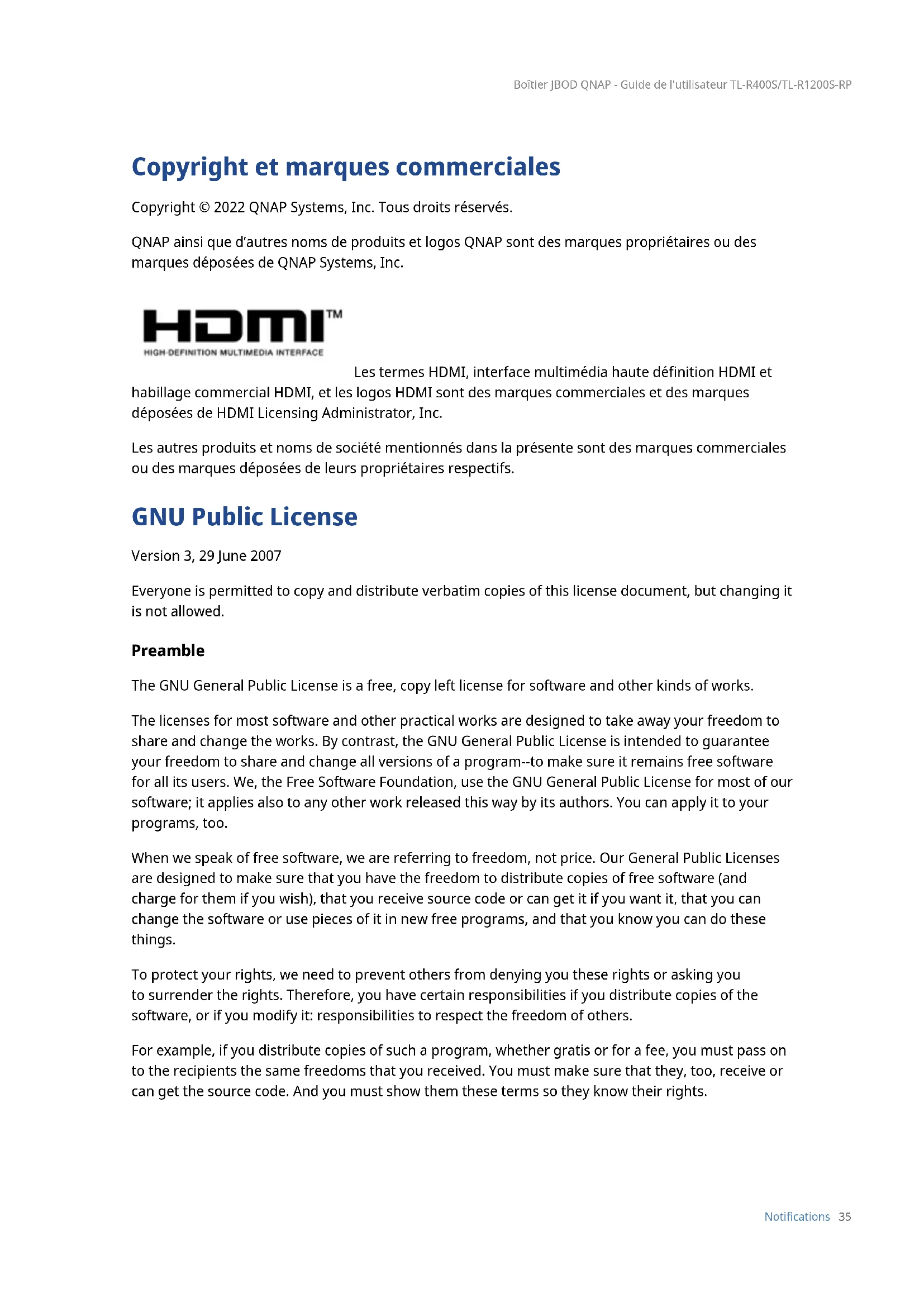 You may convey a covered work in object code form under the terms of sections 4 and 5, provided that you also convey the machine-readable Corresponding Source under the terms of this License, in one of these ways: a. Convey the object code in, or embodied in, a physical product (including a physical distribution medium), accompanied by the Corresponding Source xed on a durable physical medium customarily used for software interchange. b. Convey the object code in, or embodied in, a physical product (including a physical distribution medium), accompanied by a written oer, valid for at least three years and Boîtier JBOD QNAP - Guide de l'utilisateur TL-R400S/TL-R1200S-RP Notications 38valid for as long as you oer spare parts or customer support for that product model, to give anyone who possesses the object code either (1) a copy of the Corresponding Source for all the software in the product that is covered by this License, on a durable physical medium customarily used for software interchange, for a price no more than your reasonable cost of physically performing this conveying of source, or (2) access to copy the Corresponding Source from a network server at no charge. c. Convey individual copies of the object code with a copy of the written oer to provide the Corresponding Source. This alternative is allowed only occasionally and noncommercially, and only if you received the object code with such an oer, in accord with subsection 6b. d. Convey the object code by oering access from a designated place (gratis or for a charge), and oer equivalent access to the Corresponding Source in the same way through the same place at no further charge. You need not require recipients to copy the Corresponding Source along with the object code. If the place to copy the object code is a network server, the Corresponding Source may be on a dierent server (operated by you or a third party) that supports equivalent copying facilities, provided you maintain clear directions next to the object code saying where to nd the Corresponding Source. Regardless of what server hosts the Corresponding Source, you remain obligated to ensure that it is available for as long as needed to satisfy these requirements. e. Convey the object code using peer-to-peer transmission, provided you inform other peers where the object code and Corresponding Source of the work are being oered to the general public at no charge under subsection 6d. A separable portion of the object code, whose source code is excluded from the Corresponding Source as a System Library, need not be included in conveying the object code work. A “User Product” is either (1) a “consumer product”, which means any tangible personal property which is normally used for personal, family, or household purposes, or (2) anything designed or sold for incorporation into a dwelling. In determining whether a product is a consumer product, doubtful cases shall be resolved in favor of coverage. For a particular product received by a particular user, “normally used” refers to a typical or common use of that class of product, regardless of the status of the particular user or of the way in which the particular user actually uses, or expects or is expected to use, the product. A product is a consumer product regardless of whether the product has substantial commercial, industrial or non-consumer uses, unless such uses represent the only signicant mode of use of the product. “Installation Information” for a User Product means any methods, procedures, authorization keys, or other information required to install and execute modied versions of a covered work in that User Product from a modied version of its Corresponding Source. The information must suce to ensure that the continued functioning of the modied object code is in no case prevented or interfered with solely because modication has been made. If you convey an object code work under this section in, or with, or specically for use in, a User Product, and the conveying occurs as part of a transaction in which the right of possession and use of the User Product is transferred to the recipient in perpetuity or for a xed term (regardless of how the transaction is characterized), the Corresponding Source conveyed under this section must be accompanied by the Installation Information. But this requirement does not apply if neither you nor any third party retains the ability to install modied object code on the User Product (for example, the work has been installed in ROM). Boîtier JBOD QNAP - Guide de l'utilisateur TL-R400S/TL-R1200S-RP Notications 39The requirement to provide Installation Information does not include a requirement to continue to provide support service, warranty, or updates for a work that has been modied or installed by the recipient, or for the User Product in which it has been modied or installed. Access to a network may be denied when the modication itself materially and adversely aects the operation of the network or violates the rules and protocols for communication across the network. Corresponding Source conveyed, and Installation Information provided, in accord with this section must be in a format that is publicly documented (and with an implementation available to the public in source code form), and must require no special password or key for unpacking, reading or copying.