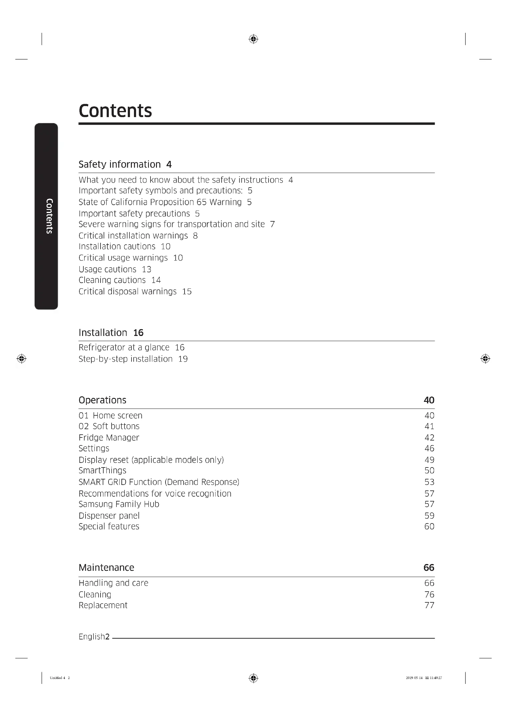 Refrigerator User manual Free Standing Appliance Untitled-4 1 2019-05-14 11:49:27English2 Contents Contents Safety information 4 What you need to know about the safety instructions 4 Important safety symbols and precautions: 5 State of California Proposition 65 Warning 5 Important safety precautions 5 Severe warning signs for transportation and site 7 Critical installation warnings 8 Installation cautions 10 Critical usage warnings 10 Usage cautions 13 Cleaning cautions 14 Critical disposal warnings 15 Installation 16 Refrigerator at a glance 16 Step-by-step installation 19 Operations 40 01 Home screen 40 02 Soft buttons 41 Fridge Manager 42 Settings 46 Display reset (applicable models only) 49 SmartThings 50 SMART GRID Function (Demand Response) 53 Recommendations for voice recognition 57 Samsung Family Hub 57 Dispenser panel 59 Special features 60 Maintenance 66 Handling and care 66 Cleaning 76 Replacement 77 Untitled-4 2 2019-05-14 11:49:27English 3 Contents Troubleshooting 79 General 79 Do you hear abnormal sounds from the refrigerator? 83 SmartThings 85 Samsung Family Hub 86 Smart Grid (applicable models only) 87 LCD 88