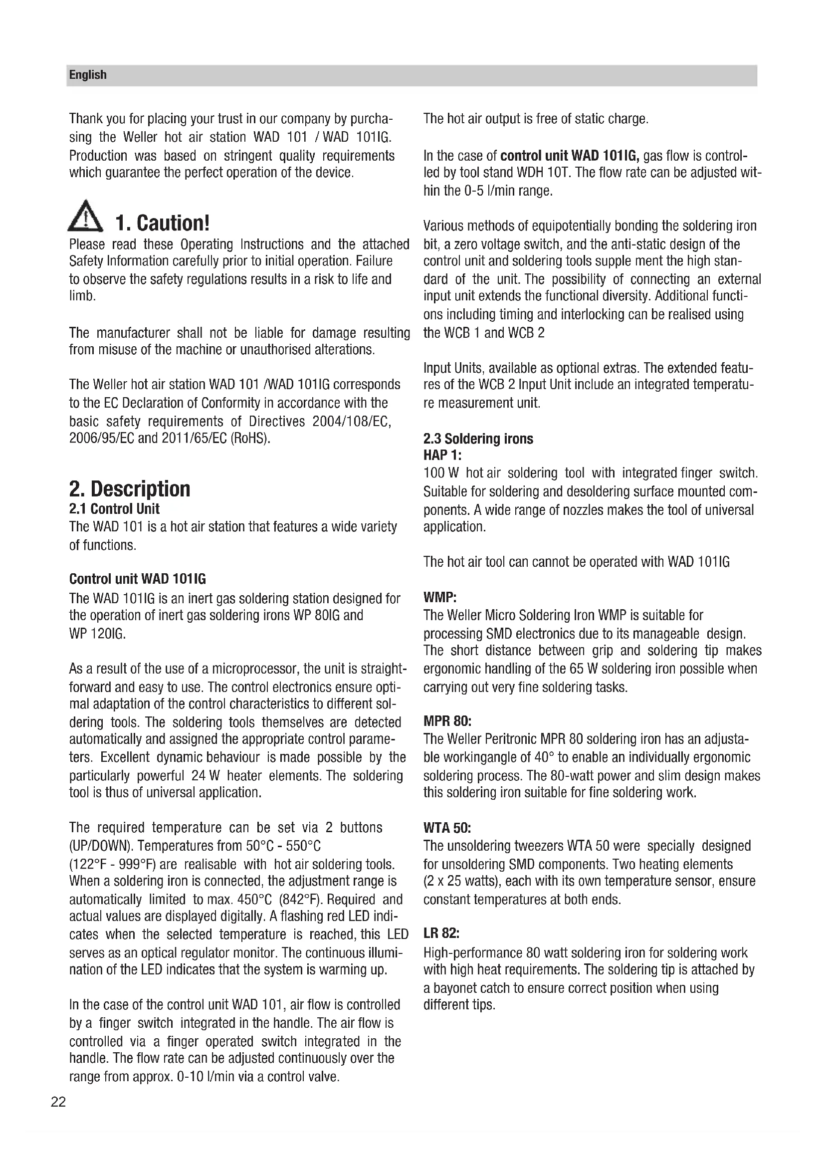 Please read these Operating Instructions and the attached Safety Information carefully prior to initial operation. Failure to observe the safety regulations results in a risk to life and limb. The manufacturer shall not be liable for damage resulting from misuse of the machine or unauthorised alterations. The Weller hot air station WAD 101 /WAD 101IG corresponds to the EC Declaration of Conformity in accordance with the basic safety requirements of Directives 2004/108/EC, 2006/95/EC and 2011/65/EC (RoHS).