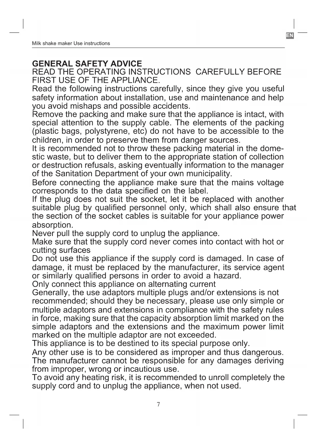 Remove the packing and make sure that the appliance is intact, with special attention to the supply cable. The elements of the packing (plastic bags, polystyrene, etc) do not have to be accessible to the children, in order to preserve them from danger sources.