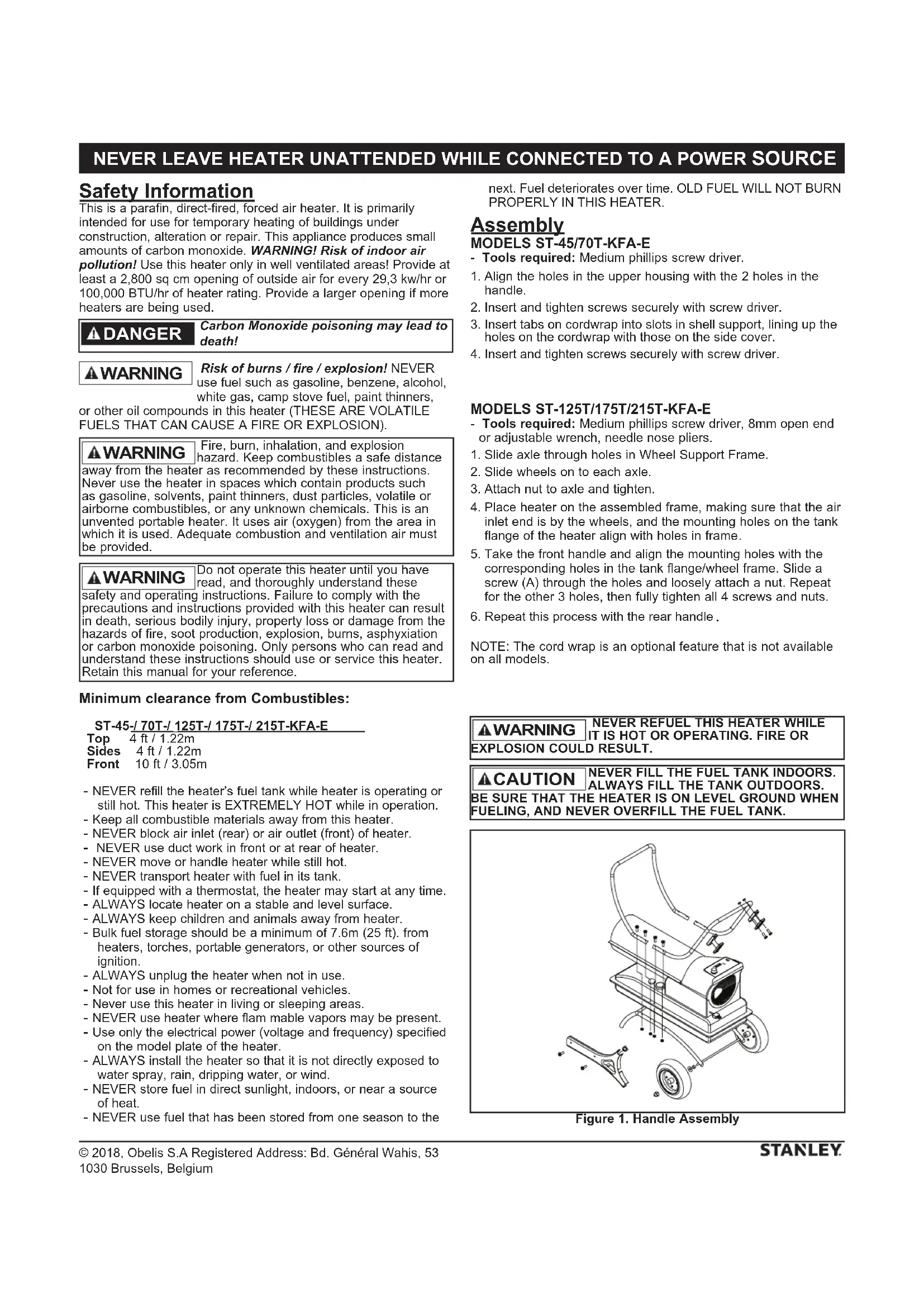 - Tools required: Medium phillips screw driver, 8mm open end or adjustable wrench, needle nose pliers.1. Slide axle through holes in Wheel Support Frame. 2. Slide wheels on to each axle.3. Attach nut to axle and tighten.4. Place heater on the assembled frame, making sure that the air inlet end is by the wheels, and the mounting holes on the tank flange of the heater align with holes in frame 5. Take the front handle and align the mounting holes with the corresponding holes in the tank flange/wheel frame. Slide a screw (A) through the holes and loosely attach a nut. Repeat for the other 3 holes, then fully tighten all 4 screws and nuts.6. Repeat this process with the rear handle NOTE: The cord wrap is an optional feature that is not available on all models. WARNING Carbon Monoxide poisoning may lead to death! DANGER NEVER REFUEL THIS HEATER WHILE IT IS HOT OR OPERATING. FIRE OR EXPLOSION COULD RESULT. WARNING NEVER FILL THE FUEL TANK INDOORS. ALWAYS FILL THE TANK OUTDOORS. BE SURE THAT THE HEATER IS ON LEVEL GROUND WHEN FUELING, AND NEVER OVERFILL THE FUEL TANK. CAUTION Figure 1. Handle AssemblyDo not operate this heater until you have read, and thoroughly understand these safety and operating instructions. Failure to comply with the precautions and instructions provided with this heater can result in death, serious bodily injury, property loss or damage from the hazards of fire, soot production, explosion, burns, asphyxiation or carbon monoxide poisoning. Only persons who can read and understand these instructions should use or service this heater. Retain this manual for your reference. WARNING Fire, burn, inhalation, and explosion hazard. Keep combustibles a safe distance away from the heater as recommended by these instructions. Never use the heater in spaces which contain products such as gasoline, solvents, paint thinners, dust particles, volatile or airborne combustibles, or any unknown chemicals. This is an unvented portable heater. It uses air (oxygen) from the area in which it is used. Adequate combustion and ventilation air must be provided. WARNING© 2018, Obelis S.A Registered Address: Bd. Général Wahis, 53 1030 Brussels, Belgium NEVER LEAVE HEATER UNATTENDED WHILE CONNECTED TO A POWER SOURCE Operation This heater is factory-tested for use with 1-K kerosene/paraffin, no. 1 & no. 2 diesel, JP8/Jet A Fuel, and no. 1 & no. 2 fuel oil. TO START THE HEATER: