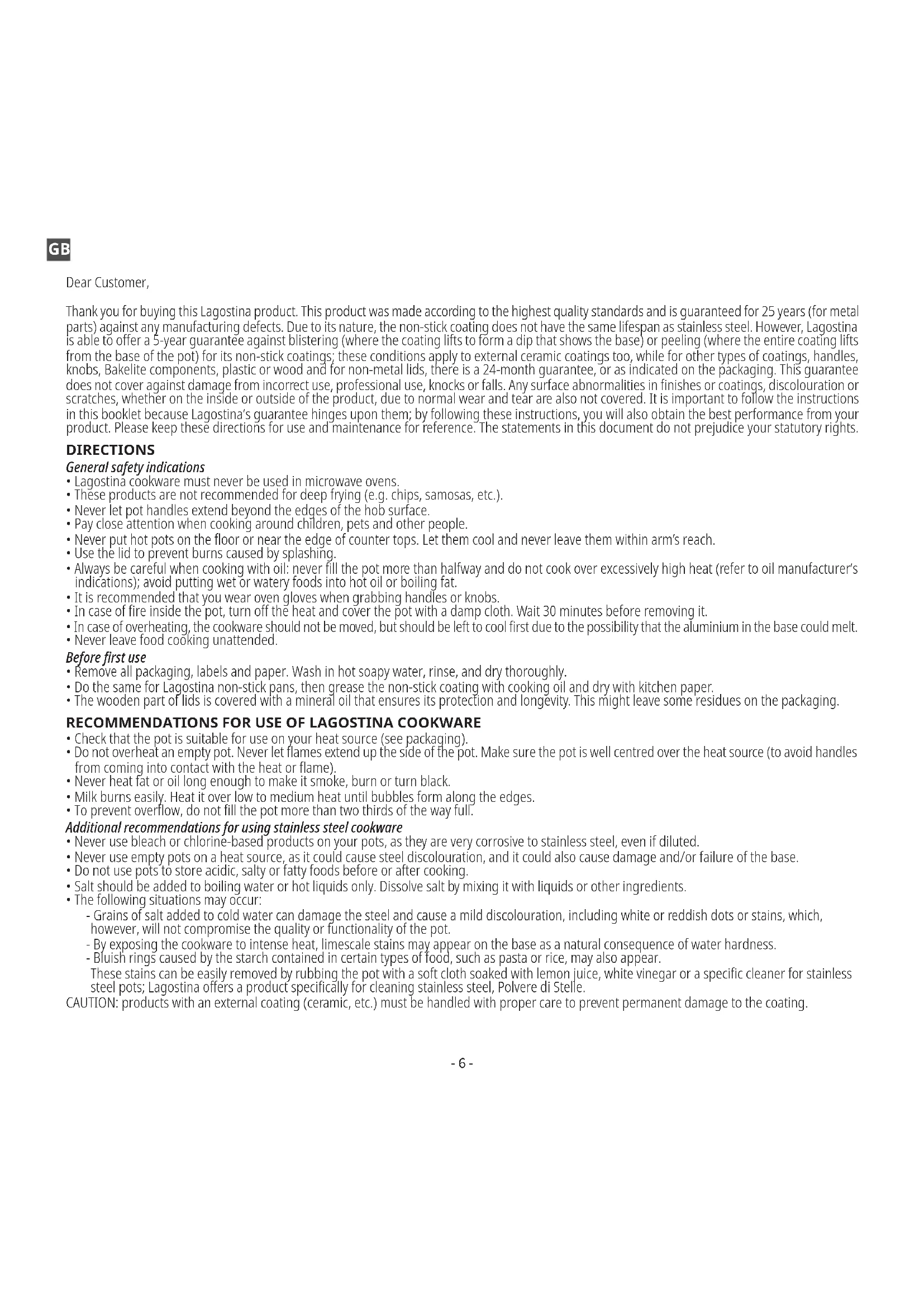 - Se si notano delle disfunzioni nell’articolo da cucina, anche dopo averlo usato per molto tempo, rivolgersi immediatamente al centro assistenza, al negoziante o alla filiale (vedi elenco contatti), o sul sito www.lagostina.com Gli articoli per cottura Lagostina sono conformi ai requisiti legislativi per i materiali a contatto con alimenti. A seconda della linea di articoli, le dimensioni indicate possono riferirsi al diametro misurato all’interno o all’estero delle pareti, sul bordo nella parte alta, oppure sul bordo arrotondato. Per maggiori informazioni, leggere la confezione o consultare il catalogo. ASSISTENZA Lagostina è un marchio registrato. In caso di problemi scrivere a contact-it@lagostina.com- 6 - Dear Customer, Thank you for buying this Lagostina product. This product was made according to the highest quality standards and is guaranteed for 25 years (for metal parts) against any manufacturing defects. Due to its nature, the non-stick coating does not have the same lifespan as stainless steel. However, Lagostina is able to offer a 5-year guarantee against blistering (where the coating lifts to form a dip that shows the base) or peeling (where the entire coating lifts from the base of the pot) for its non-stick coatings; these conditions apply to external ceramic coatings too, while for other types of coatings, handles, knobs, Bakelite components, plastic or wood and for non-metal lids, there is a 24-month guarantee, or as indicated on the packaging. This guarantee does not cover against damage from incorrect use, professional use, knocks or falls. Any surface abnormalities in finishes or coatings, discolouration or scratches, whether on the inside or outside of the product, due to normal wear and tear are also not covered. It is important to follow the instructions in this booklet because Lagostina’s guarantee hinges upon them; by following these instructions, you will also obtain the best performance from your product. Please keep these directions for use and maintenance for reference. The statements in this document do not prejudice your statutory rights. DIRECTIONS General safety indications
