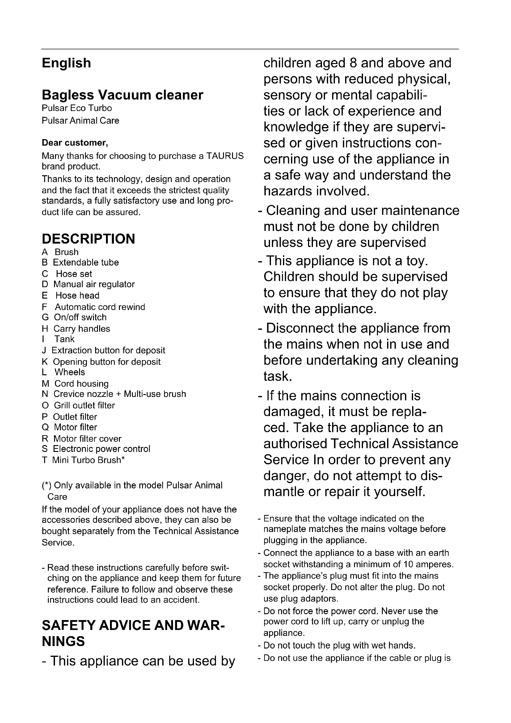 Clase de (re)emisión de polvo C Nivel de potencia acústica 78 dB Potencia nominal de entrada 800 WEnglish Bagless Vacuum cleaner Pulsar Eco Turbo Pulsar Animal Care Dear customer, Many thanks for choosing to purchase a TAURUS brand product. Thanks to its technology, design and operation and the fact that it exceeds the strictest quality standards, a fully satisfactory use and long pro- duct life can be assured. DESCRIPTION A Brush B Extendable tube C Hose set D Manual air regulator E Hose head F Automatic cord rewind G On/off switch H Carry handles I Tank J Extraction button for deposit K Opening button for deposit L Wheels M Cord housing N Crevice nozzle + Multi-use brush O Grill outlet lter P Outlet lter Q Motor lter R Motor lter cover S Electronic power control T Mini Turbo Brush* (*) Only available in the model Pulsar Animal Care If the model of your appliance does not have the accessories described above, they can also be bought separately from the Technical Assistance Service. - Read these instructions carefully before swit- ching on the appliance and keep them for future reference. Failure to follow and observe these instructions could lead to an accident.