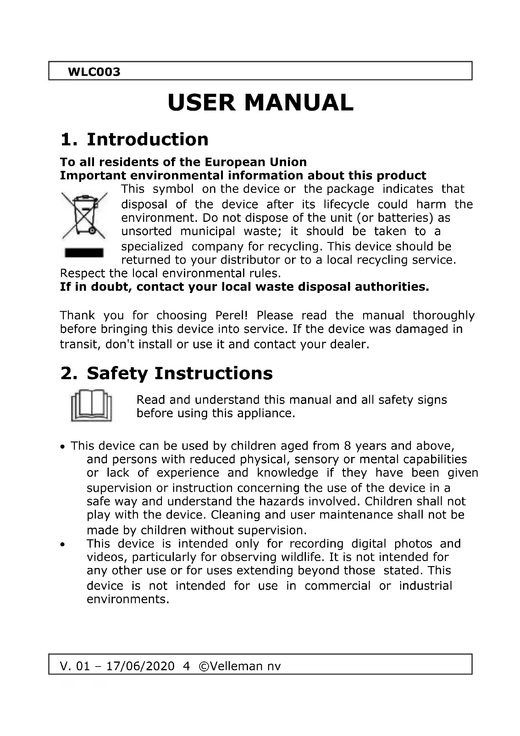 Download the instructions for your Camera in PDF format for free! Find your manual WLC003 - Perel and take your electronic device back in hand. On this page are published all the documents necessary for the use of your device. WLC003 by Perel.