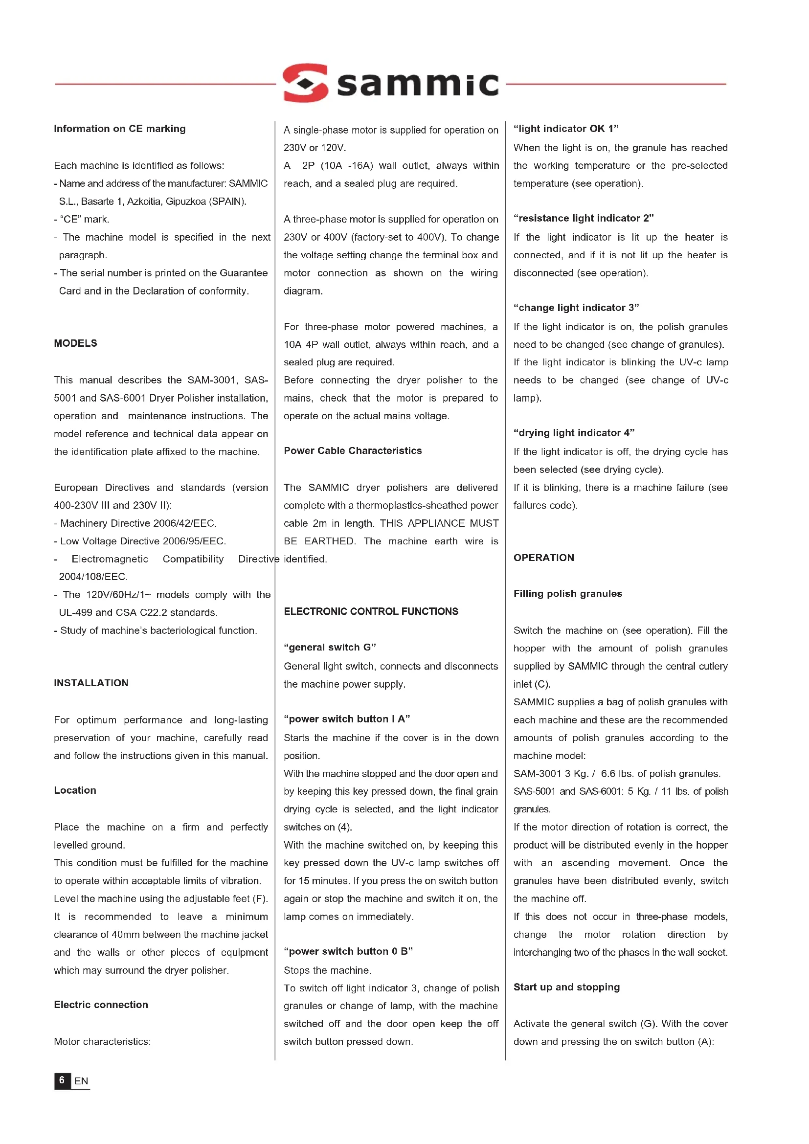 This manual describes the SAM-3001, SAS-5001 and SAS-6001 Dryer Polisher installation, operation and maintenance instructions. The model reference and technical data appear on the identification plate affixed to the machine.