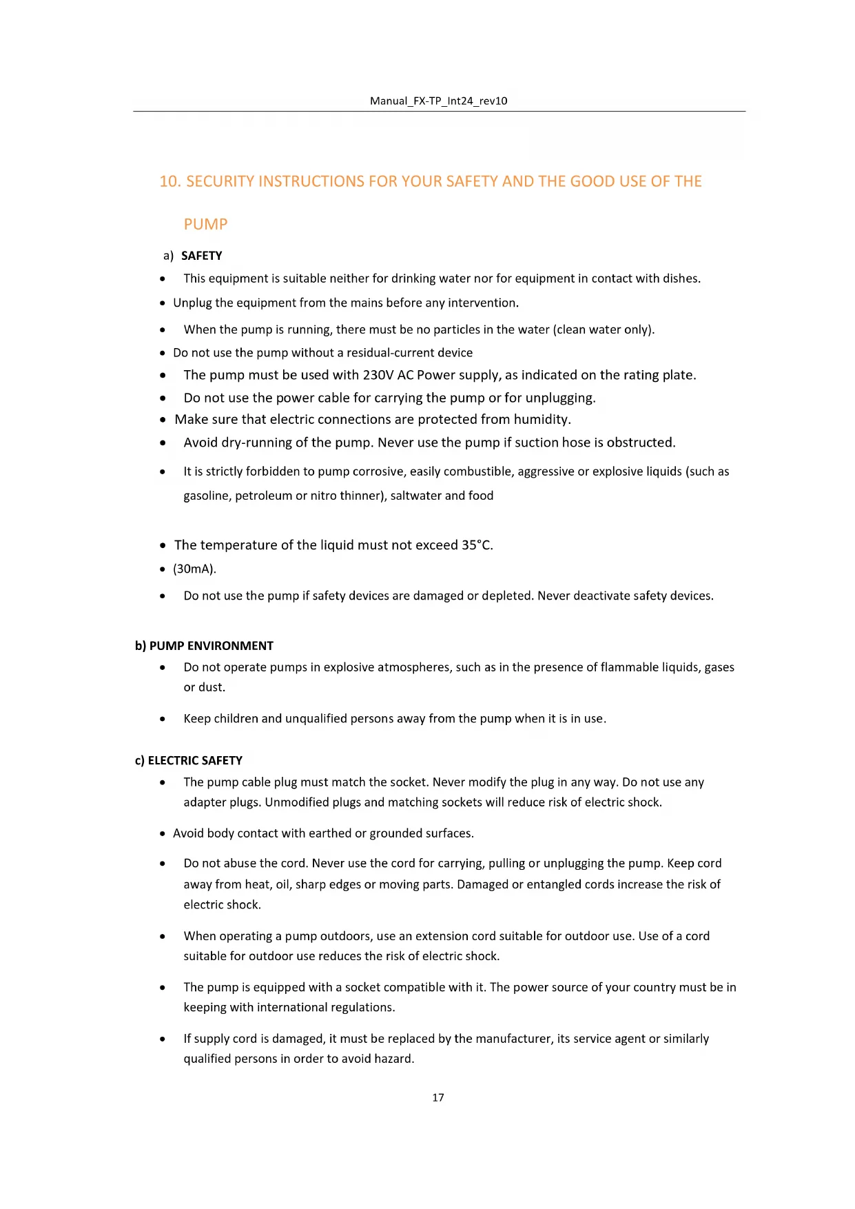 TROUBLESHOOTING Trouble Pls check Should do The engine does not start and does not make noise. Is the pump plugged? Does the pump starts when fully submerged? Check your electrical installation Check that the float can move freely Pump does not deliver. Does the impeller rotates? Is it in good condition? Is the pump inlet free? The delivery head requested exceeds the requirements of the pump or the discharge pipe is too narrow Eliminate the reason for blocking Replace the impeller Clean the pump inlet Use the pump in accordance with its technical capabilities Increase the pipe diameter The pump stops suddenly Is there a sufficient water level to suck? Did the pump run for a long time without stopping? Are you sure that the pump inlet is not obstructed? Do the power of the mains match the rating plate? Is the temperature of the liquid less than 35°C? Disconnect the pump from the mains and let it cool for a few tens of minutes Clean the pump inlet Use a power supply matching the rating plate Observe the maximum allowable temperature Flow decreases Is the pump inlet clean? Is the impeller clean? The discharge pipe is not partially clogged? Clean the area or areas in question (s) Low flow or insufficient Are you sure that the pump inlet is not obstructed? Is the impeller clean? Are you sure that the outlet pipe is not obstructed? Is the diameter of the discharge pipe enough? Clean the zone (s) concerned and verify check valve, if applicable Connecting a pipe with a suitable diameter and suppress reduction of the water passageManual_FX-TP_Int24_rev10