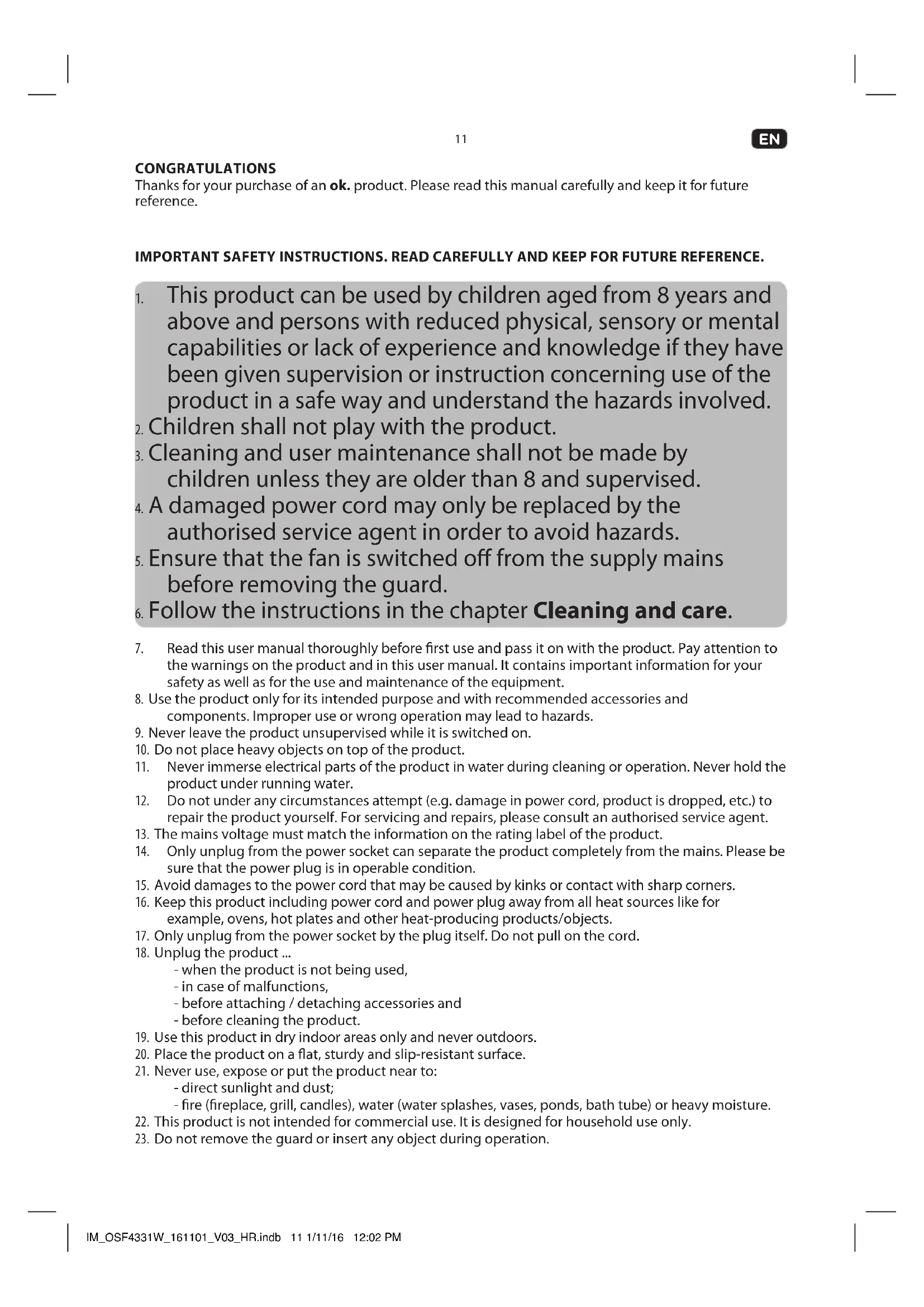 Download the instructions for your Fan in PDF format for free! Find your manual OSF 4331 W - OK and take your electronic device back in hand. On this page are published all the documents necessary for the use of your device. OSF 4331 W by OK.