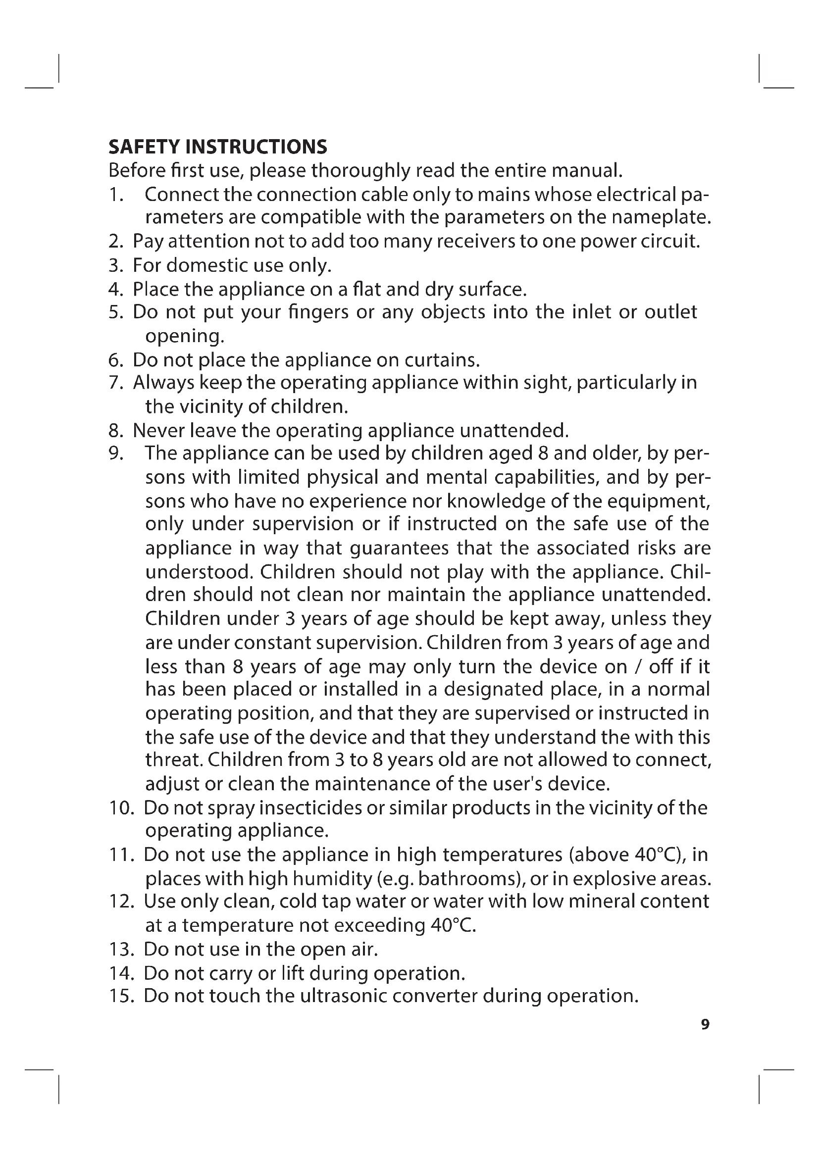 INTENDED USE The ultrasonic humidier NU40 is designed to improve air quality in living quarters. The appropriate level of air humidity improves the well-being and quality of sleep. Additionally, it is equipped with an aromatherapy function - the device can be used with aromatic water additives intended for humidiers. Natural air ionization, resulting from the breaking of water particles, additionally cleans the humidied air and reduces the amount of bacteria present in it. USE - Before use, check that the appliance is complete and undamaged. - Do not place the appliance on acarpet, lining, parquet oor, or any surface which can be damaged by water or moisture. - It is recommended to place the humidier at aminimum height of 1 m from the oor. - Fragrant-water additives (oils, etc.) for humidiers may be used with the appliance. The essential oil can only be poured on asponge, which is placed in areservoir (10).WARNING. Pouring the oils directly into the tank (3)) can damage the humidier. Such damage is not subject to warranty repair. OPERATION - Make sure the appliance is turned o and disconnected from the power supply. - Remove the nozzle (1) with one hand on the tank (3) and remove the lid (2). - Insert atube (8) into the container – Fig. 1 and push the oat (7).WARNING. The device may only be switched on if ahose (8) with oat (7) is tted. - Fill the tank (3) with water to the maximum level (11). - Place the lid (2) on the container (3) and the nozzle (1) on it. - Plug the appliance into the mains, complying with the parameters specied above. The appliance will enter the stand-by mode. No function is active, and the display is switched o.All changes in the settings are conrmed with an audio signal.ON/OFF (SWITCHING ON / SWITCHING OFF) Pressing the button (A) will cause the display to activate. The humidier will start running at the highest level of humidication, with the fan motor running. The humidity level is displayed. Pressing the button (A) again will switch o the unit and make it enter the stand-by mode.HUMIDITY (MIST) The appliance is tted with athree-stage control of humidication. The level of humidication is changed with the button (B). Changes are displayed with the numbers 1 to 3 on the display.HYGROSTAT (HYGROMETER) This function allows to set the level of humidity from 45–90% in 5% steps. The appliance will start after about 3 seconds of entering GENERAL DESCRIPTION1. Nozzle2. Cover3. Water tank4. Control panel5. Lamp6. Float 17. Float 28. Control tube9. Air outlet10. Oil reservoir11. Maximum water level indicator12. Ultrasonic transducer13. Remote control