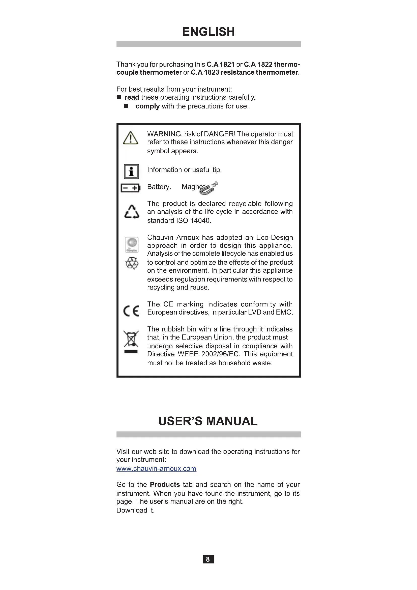 WARNING, risk of DANGER! The operator must refer to these instructions whenever this danger symbol appears. Information or useful tip. Battery. Magnet. The product is declared recyclable following an analysis of the life cycle in accordance with standard ISO 14040. Chauvin Arnoux has adopted an Eco-Design approach in order to design this appliance. Analysis of the complete lifecycle has enabled us to control and optimize the effects of the product on the environment. In particular this appliance exceeds regulation requirements with respect to recycling and reuse. The CE marking indicates conformity with European directives, in particular LVD and EMC. The rubbish bin with a line through it indicates that, in the European Union, the product must undergo selective disposal in compliance with Directive WEEE 2002/96/EC. This equipment must not be treated as household waste. Thank you for purchasing this C.A 1821 or C.A 1822 thermo- couple thermometer or C.A 1823 resistance thermometer. For best results from your instrument: read these operating instructions carefully, comply with the precautions for use.