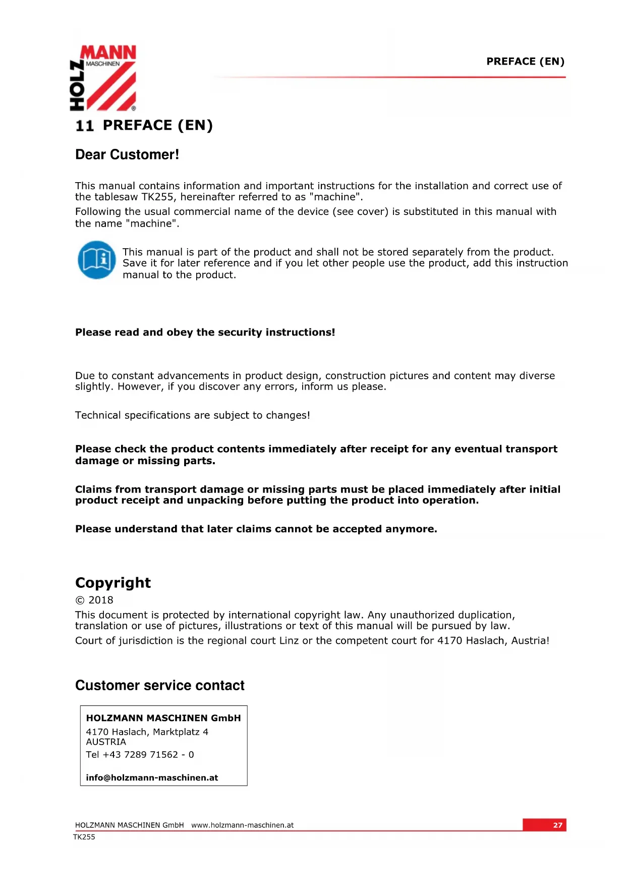 HOLZMANN MASCHINEN assumes no responsibility or warranty for any other use or use beyond this and for any resulting damage to property or injuries.