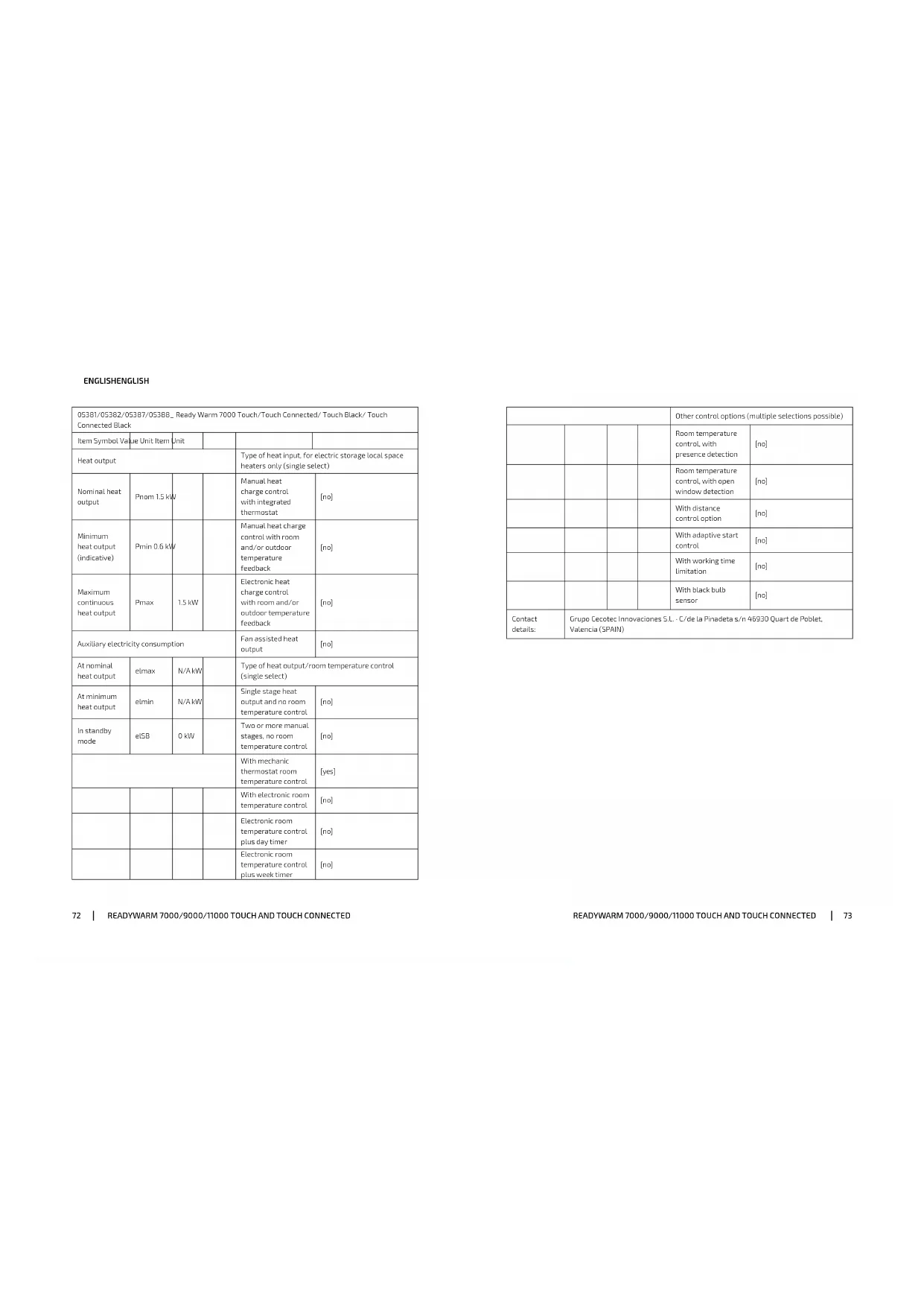 ventilation, as this may cause electric shock, re or damage the heater. Do not allow the cord to touch hot surfaces. Do not place on or near a hot gas or electric burner. Never use the appliance with a damaged cord or plug or after the appliance has malfunctioned or been damaged in any way. This device is lled with a precise quantity of special oil. Repairs requiring opening of the oil container are only to be made by the Technical Support Service of Cecotec, who should be contacted if there is an oil leakage. Do not use this device in the immediate surroundings of a bath, a shower or a swimming pool. Never attempt to open any part or dismantle the controls. Do not place the appliance immediately below a power socket. Do not turn the device upside-down during operation. The product’s surface will reach high temperatures during operation. Avoid skin from getting in contact with it and use the handle to move it. Any reparation that requires opening the oil tank must be carried out by a qualied person. Contact the ofcial Technical Support Service of Cecotec if leakage is detected. Follow the special regulations concerning the disposal of oil when the device is going to be disposed of. Avoid the use of an extension cord as this may overheat and cause a risk of re. Do not use any multiple sockets. Do not connect other high-power appliance to the same circuit. The appliance is not intended to be used by children under the age of 8. It can be used by children over the age of 8, as long as they are given continuous supervision. This appliance can be used by children aged 8 and above, and persons with reduced physical, sensory or mental capabilitiesREADYWARM 7000/9000/11000 TOUCH AND TOUCH CONNECTEDREADYWARM 7000/9000/11000 TOUCH AND TOUCH CONNECTED 1110